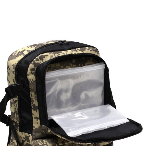Фронтальное отделение на молнии габаритами 20 х 4 х 20,5 см. Внутри 5 отстегивающихся Zip Lock пакетов габаритами 18,5 х 12,5 см. Внешний карман на молнии.