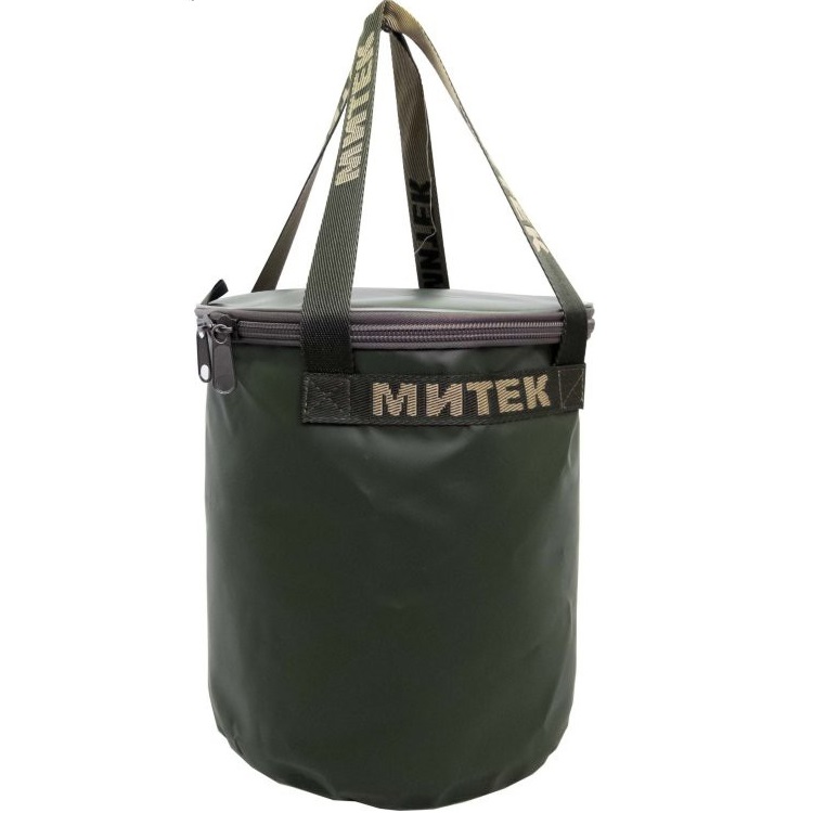 В разложенном виде ведро хорошо держит форму. Имеются две длинные ручки из широкой стропы, которые надежно закреплены на бортах. Крышка имеет надежную молнию № 10 с двумя замками. По всей длине молния имеет бортик, который дает дополнительную защиту от протекания.