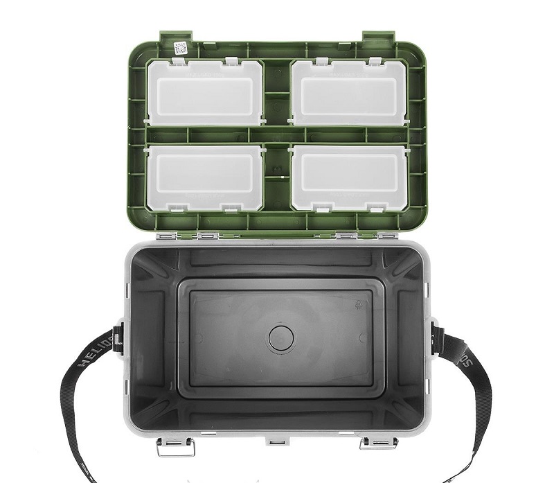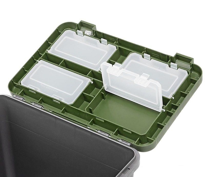 Основной отсек предназначен для переноски рыболовных снастей, термоса, так же удобен для перевозки улова. На внутренней стороне крышки размещены 4 отеделения с полупрозразчными крышечками для хранения мелких аксессуаров.
