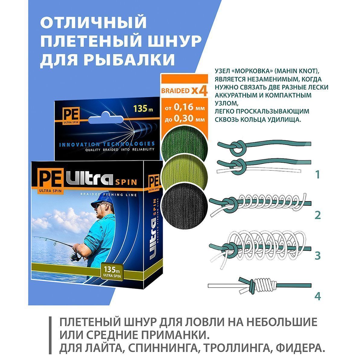 Дополнительная полировка поверхности шнура позволяет ему легко проходить сквозь кольца, а как следствие - возможность сделать очень дальний заброс. Подготовка к рыбалке станет простой из-за удобной размотки в 135 метров. PE ULTRA SPIN - это выбор на любую рыбалку.