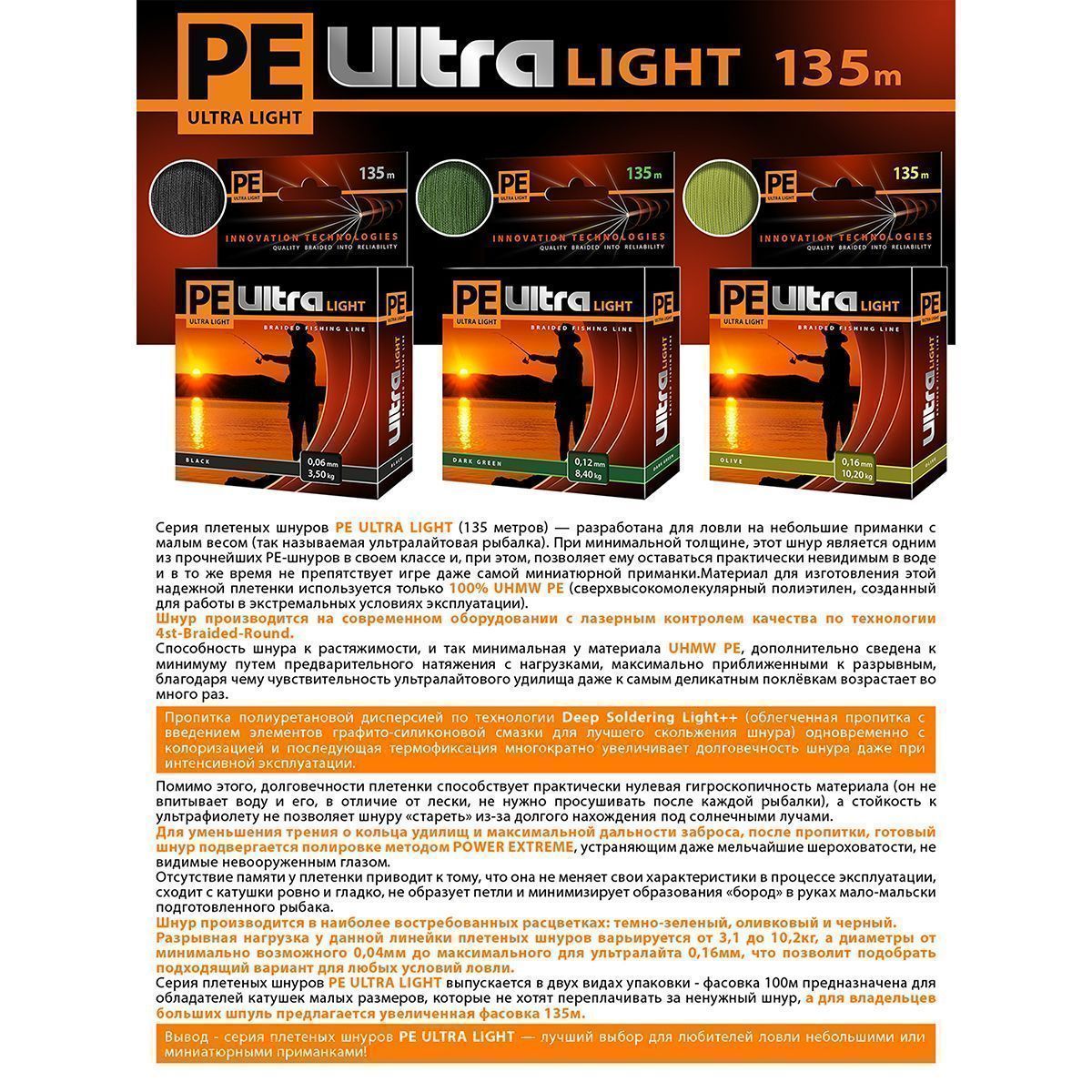 Минимальная толщина шнура помогает ему оставаться практически не видимым в воде и в тоже время не препятствует игре приманки, а практически нулевая растяжимость передает рыбаку малейший контакт приманки с рыбой. PE ULTRA LIGHT - лучший выбор для любителей ловли небольшими или миниатюрными приманками.
