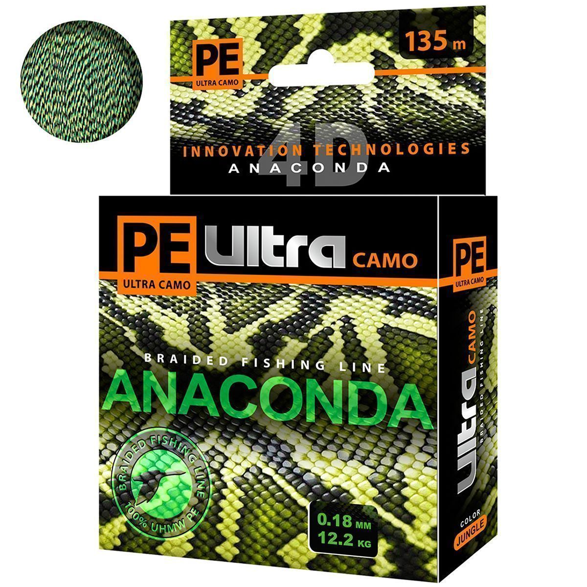 Шнур Aqua PE Ultra Anaconda 135м 0,18мм 12,2кг КМФ зеленый