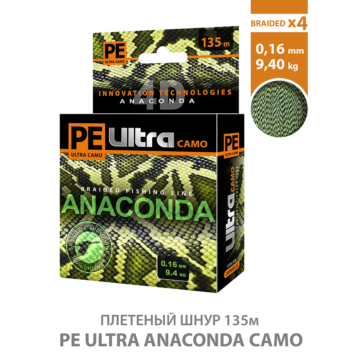 Шнур Aqua PE Ultra Anaconda 135м 0,16мм 9,4кг КМФ зеленый