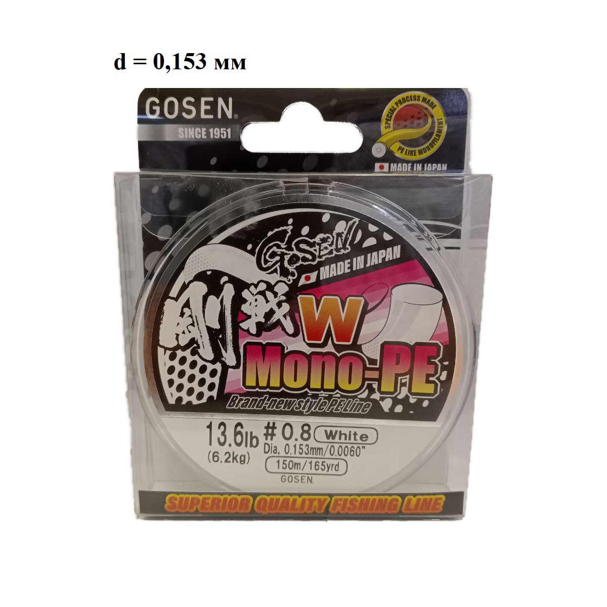 Шнур Gosen W Mono PE 150м 0,153мм 6,2кг белый (0.8PE)