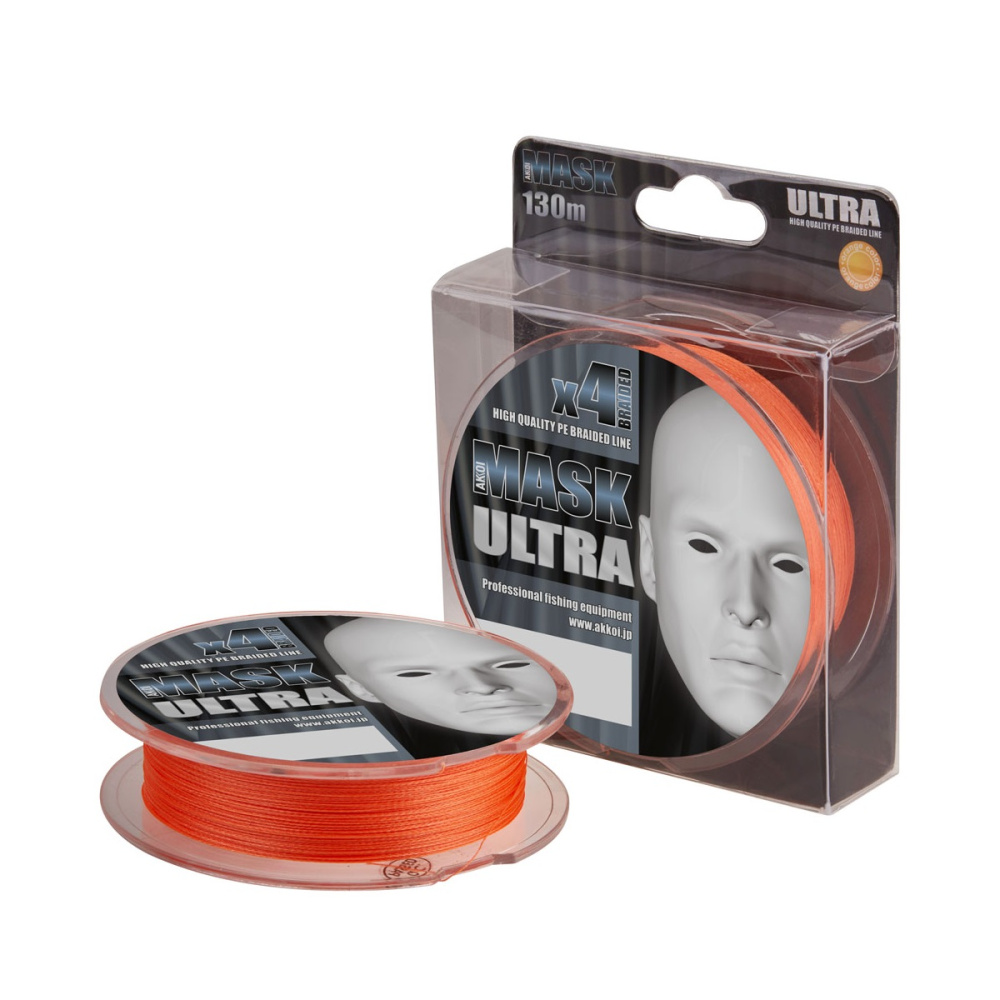 Плетеный шнур MASK ULTRA создан с учетом всех требований этого класса. Материал Super PE, высокая плотность плетения, специальная обработка для большего скольжения и максимальная устойчивость к абразивному воздействию. Шнур четырех-жильный, в размотке 130 метров и двух вариациях цветов: тёмно-зелёном и ярко оранжевом. Диапазон диаметров тоже разработан с учетом класса ловли «ультралайт-лайт» — от 0,05 до 0,20 мм.