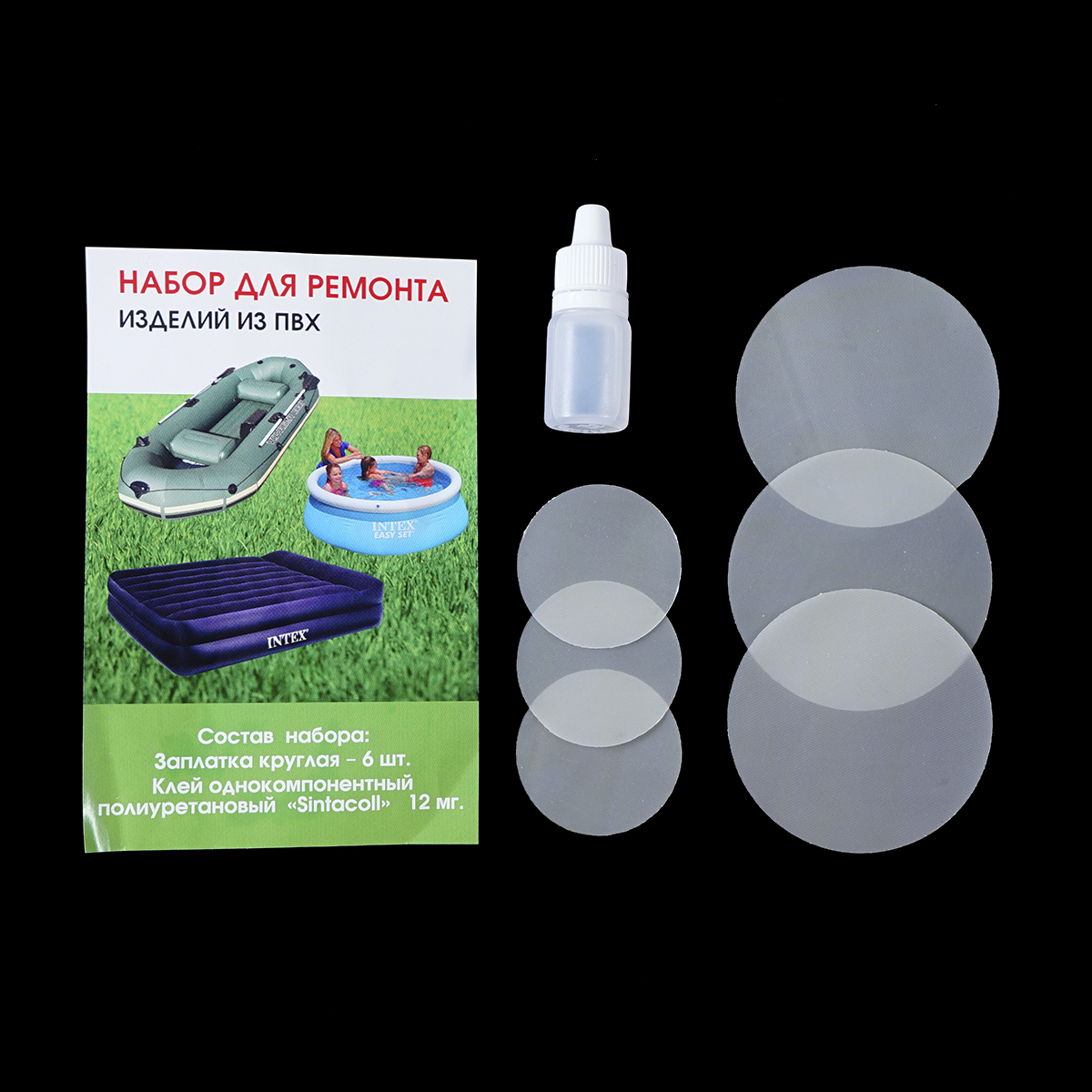 Комплект состоит из тюбика клея Sintacoll (однокомпонентный полиуретановый клей), заплаток (круглые 6 шт.)