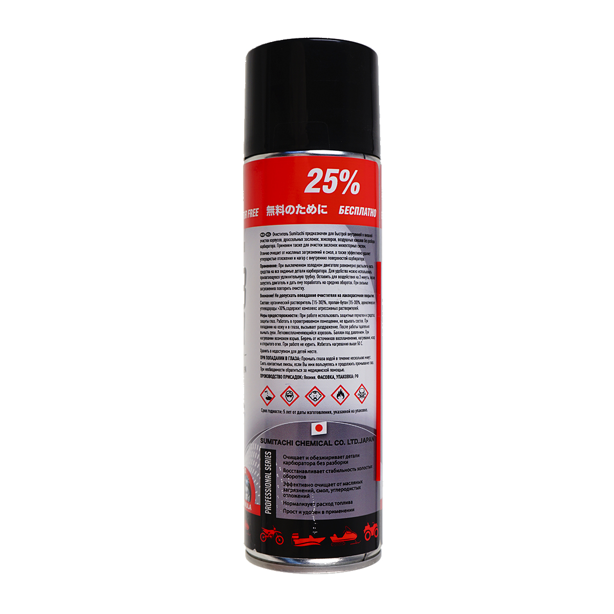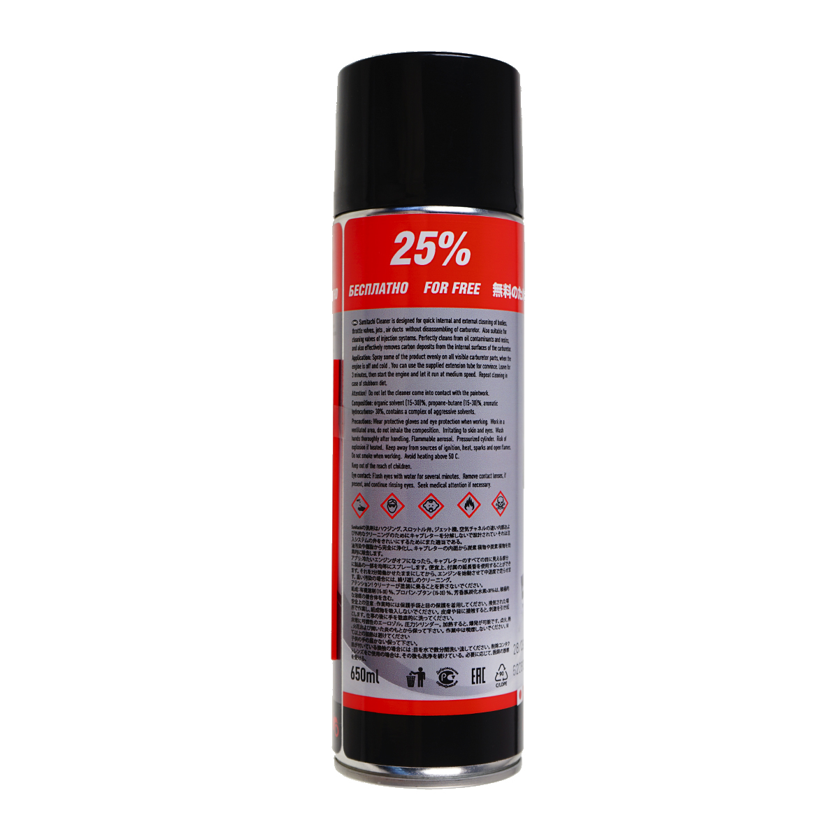 Применение: при выключенном холодном двигателе равномерно распылить часть средства на все видимые детали карбюратора. Для удобства можно использовать прилагающуюся удлинительную трубку. Оставить для воздействия на 3 минуты, после запустить двигатель и дать ему поработать на средних оборотах. При сильных загрязнениях повторить очистку.
