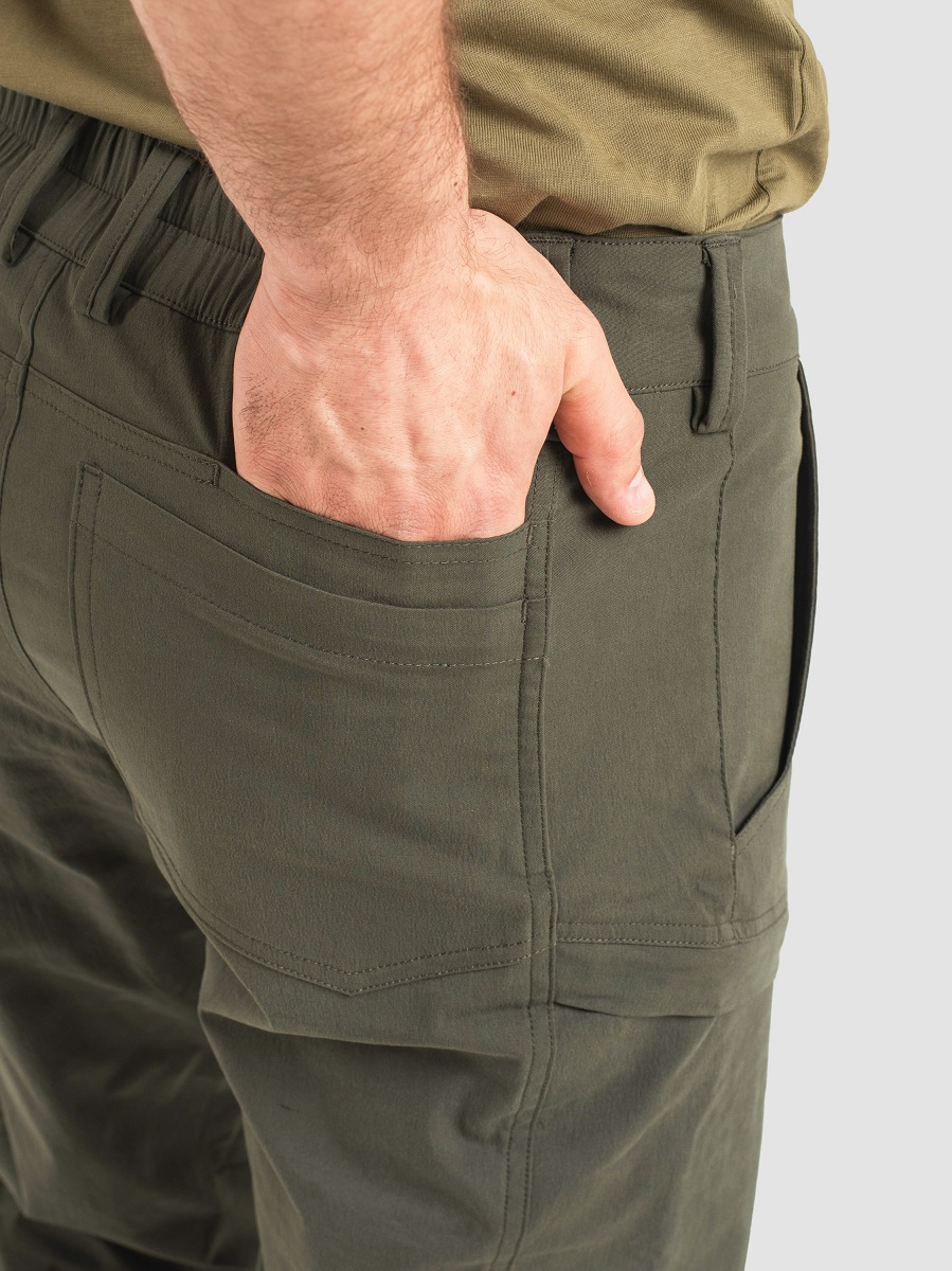 - Специальная посадка по бедрам и талии — брюки не сползают и не сковывают движения.