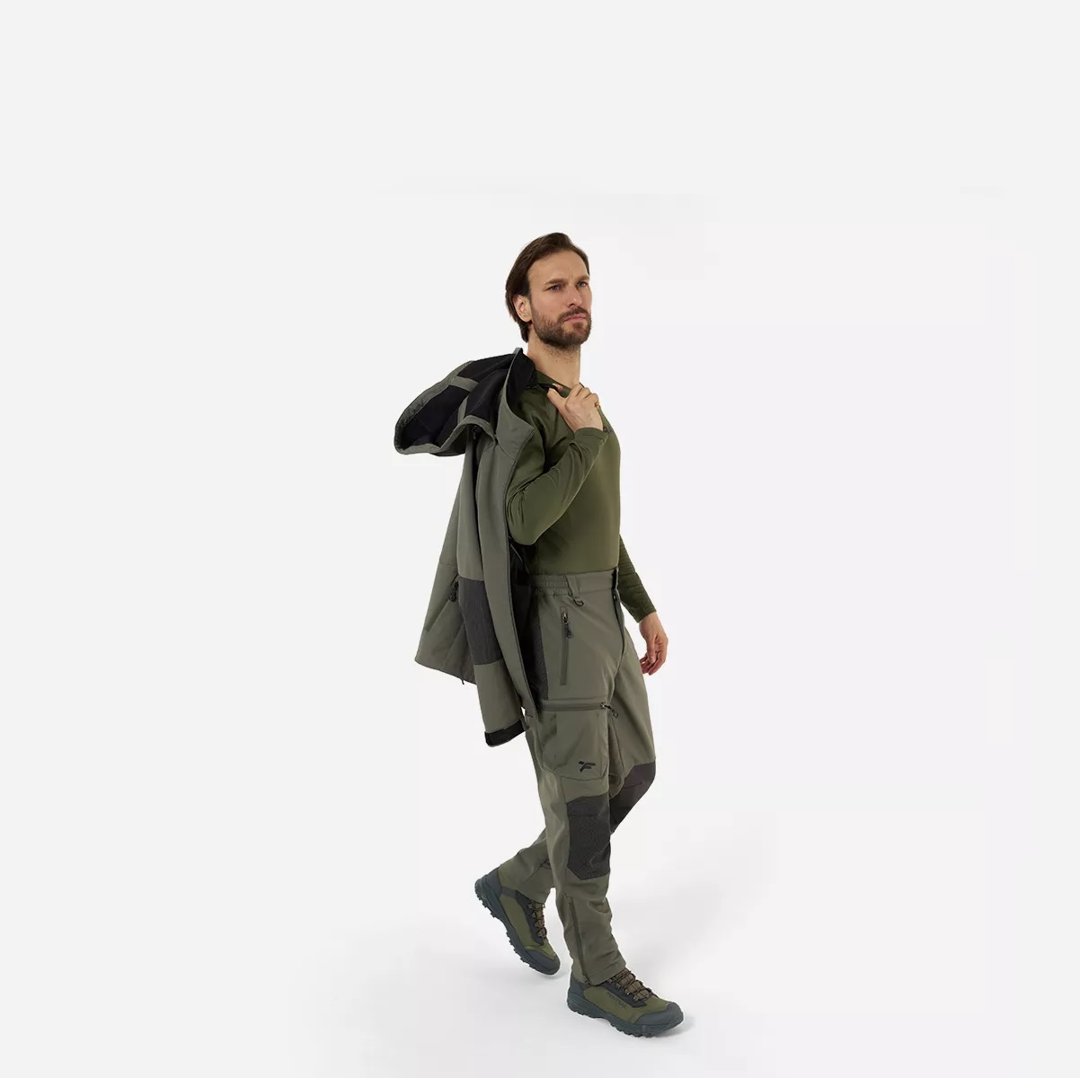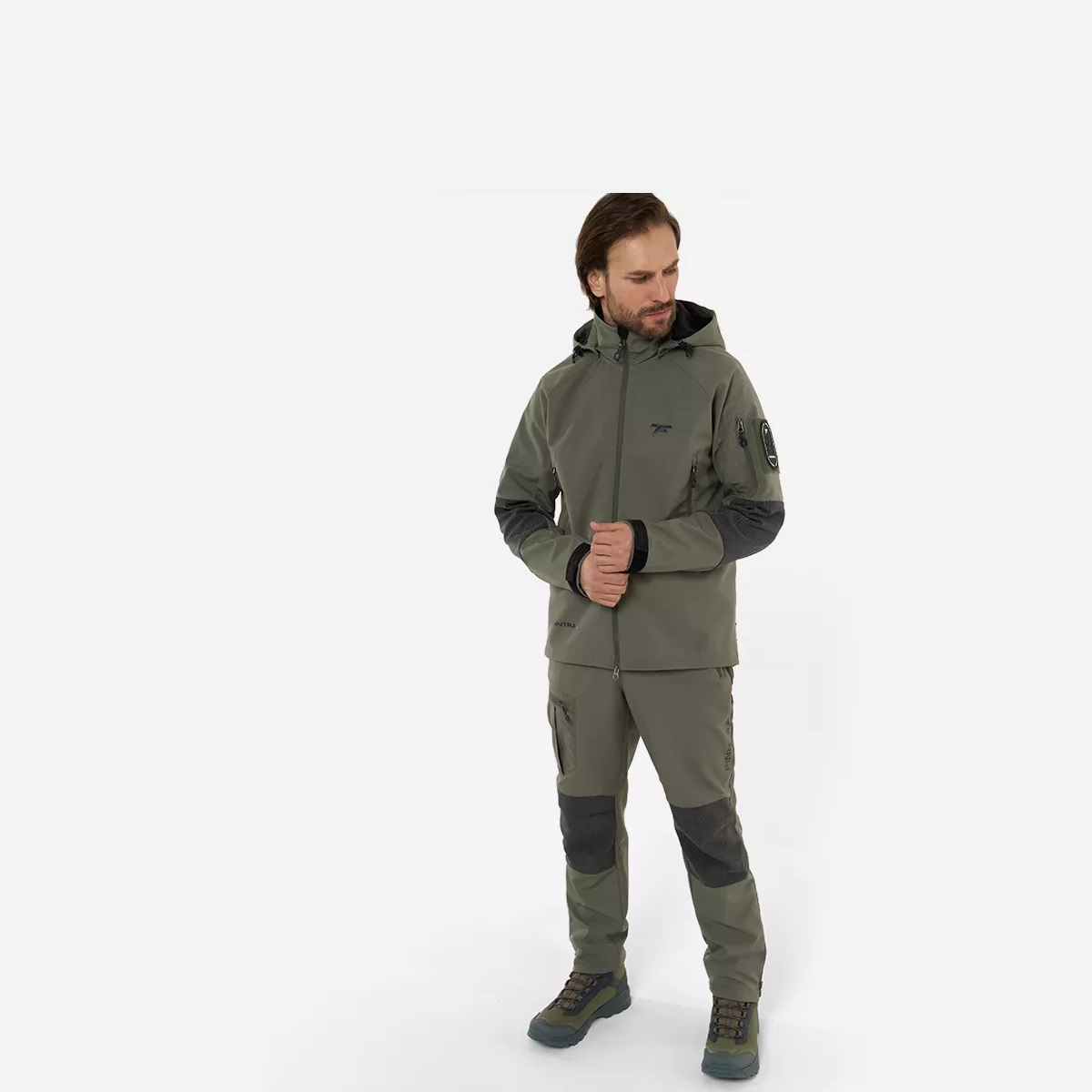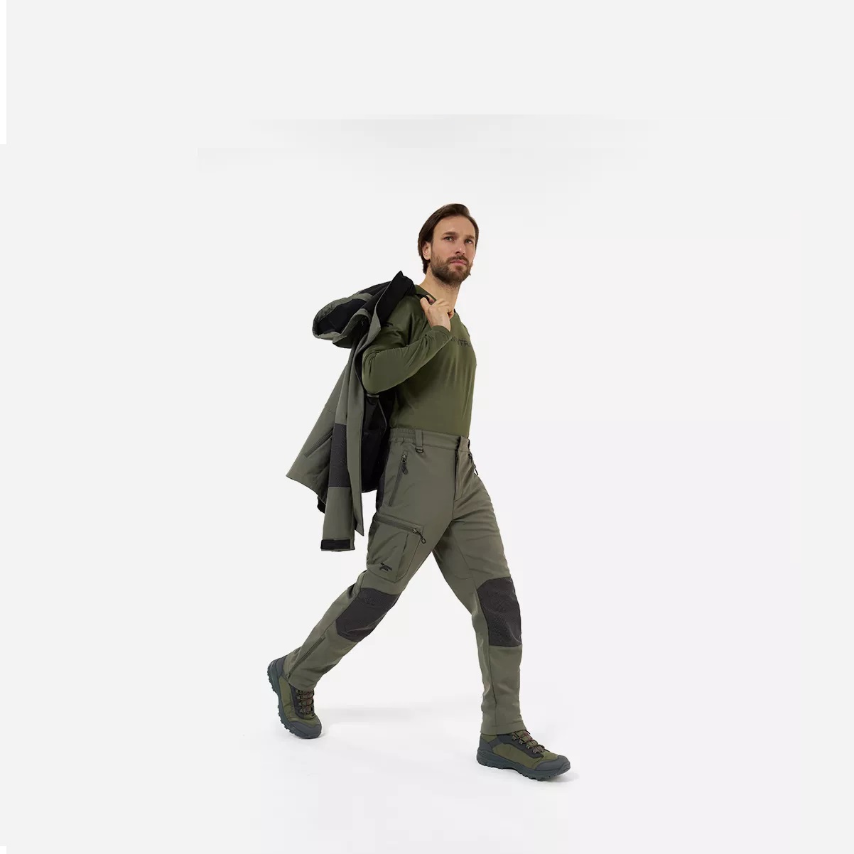 3-слойный материал SoftShell с мембраной и водонепроницаемостью до 7 000 мм выдерживает небольшой дождь, а внутренний флисовый слой хорошо сохраняет тепло. Влагоотталкивающее покрытие DWR задерживает воду и не оставляет на поверхности ткани разводов и жидкой грязи. Благодаря анатомическому крою создаётся максимально комфортная посадка и полная свобода движений. В местах, подверженных наибольшей нагрузке, ткань