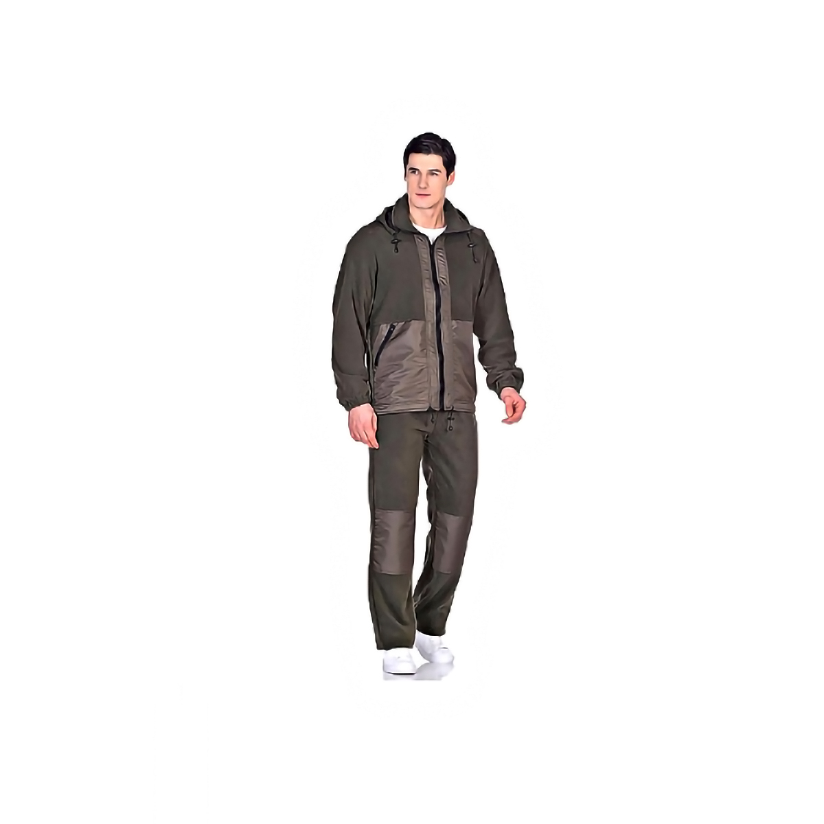 Брюки свободного покроя с карманами в боковых швах. Верхний срез брюк с цельновыкроенным поясом, в пояс вставлена тканево-резиновая тесьма, простроченная посередине. Наколенники из отделочной ткани кошачий глаз. Имеется отстегивающийся капюшон из флиса.