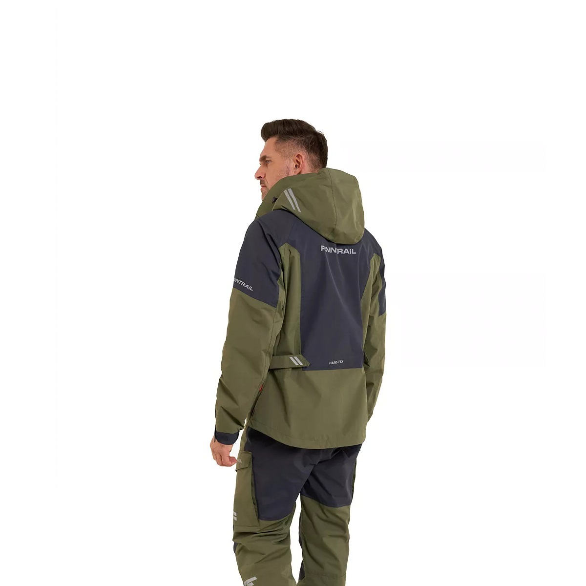 и водонепроницаемостью 12 000 мм на 100% защищают от влаги и ветра. Костюм из такого материала обладает высокой прочностью и устойчив к повреждениям. Пропитка DWR предотвращает впитывание вязкой грязи и влаги, препятствуя появлению на поверхности следов и разводов. Структура ткани позволяет сохранять комфорт в течение 24 часов под проливным дождём. Функциональный дизайн модели объединяет в себе продуманные детали, оригинальный графитовый цвет и фирменный логотип FINNTRAIL. Эргономичный крой брюк и куртки обеспечивает полную свободу движений. Регулируемый в двух плоскостях капюшон позволяет настроить максимально комфортный объём. При необходимости он легко убирается в воротник.