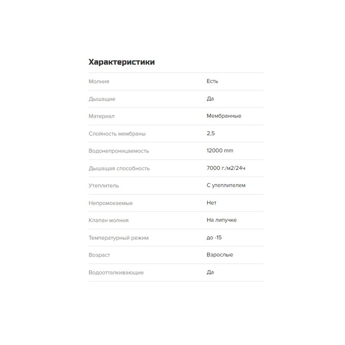 2,5-слойный материал RIPSTOP (усиленная ткань с армированной нитью) с мембраной HARD-TEX (износостойкий, дышащий материал) на 100% защищает от воды и ветра. В составе ткани использован утеплитель Thermalrate (теплоизолирующее, дышащее синтетическое волокно) и подкладка с вставками из микрофлиса. Костюм из такого материала обладает высокой прочностью и устойчив к повреждениям. Пропитка DWR (водоотталкивающее покрытие) предотвращает впитывание вязкой грязи и влаги, препятствуя появлению на поверхности следов от разводов. Структура ткани позволяет находиться под дождём и мокрым снегом, сохраняя тепло и комфорт при температуре до -15°C. Артикулированный крой учитывает анатомию человеческого тела и обеспечивает полную свободу движений.