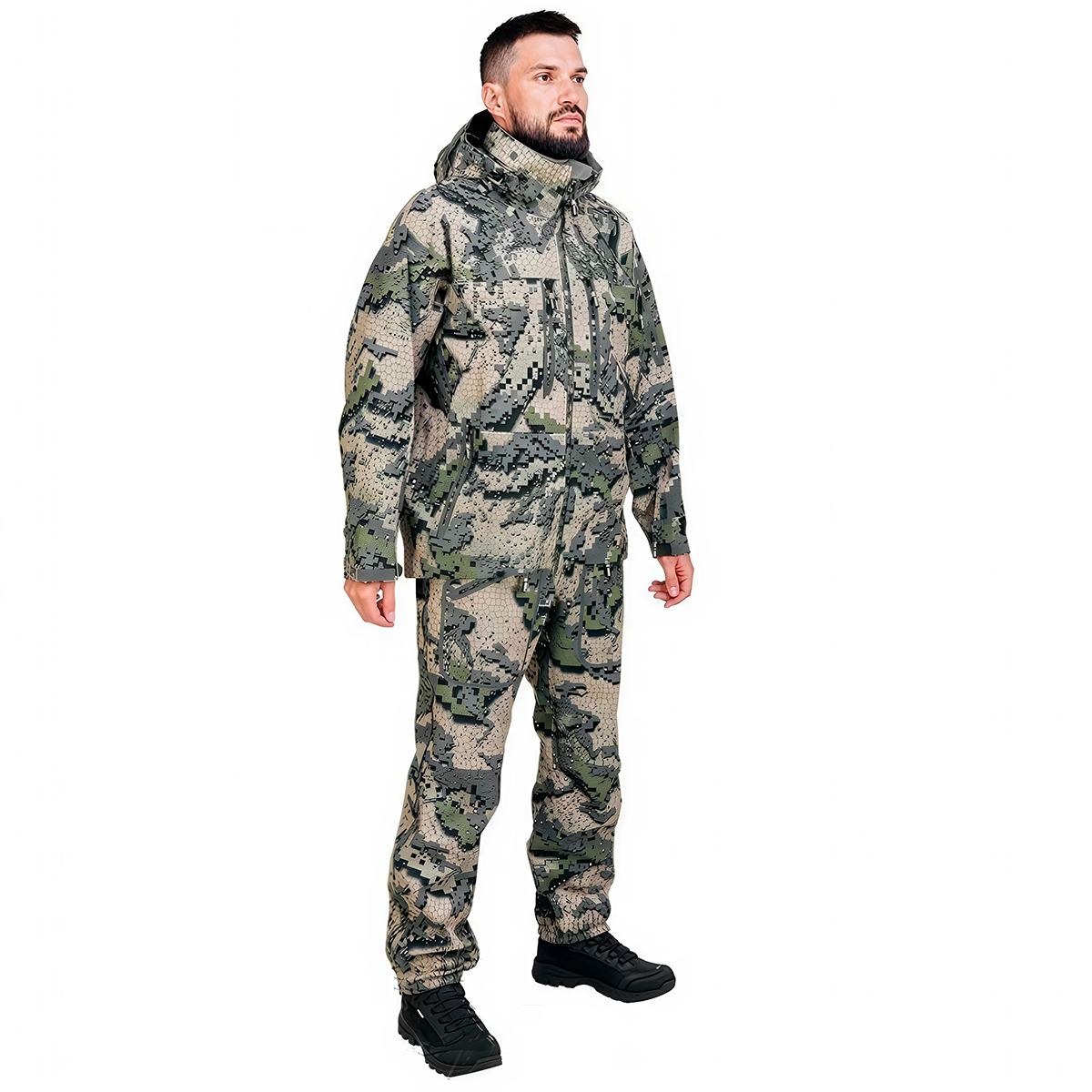 Мембранный комплект создан для охоты и активной рыбалки в переменчивую погоду. Внешний слой из 100% полиэстера с покрытием ТПУ блокирует дождь и ветер, а легкая подкладка поддерживает комфорт при ходьбе и во время засидки. Тихая ткань и «бесшумный» ход молний помогают оставаться незаметным на номере. Куртка оснащена высоким воротником и убираемым в воротник капюшоном, подмышечными вентиляционными молниями и регулировками по манжетам и низу — подстроить посадку можно за секунды.