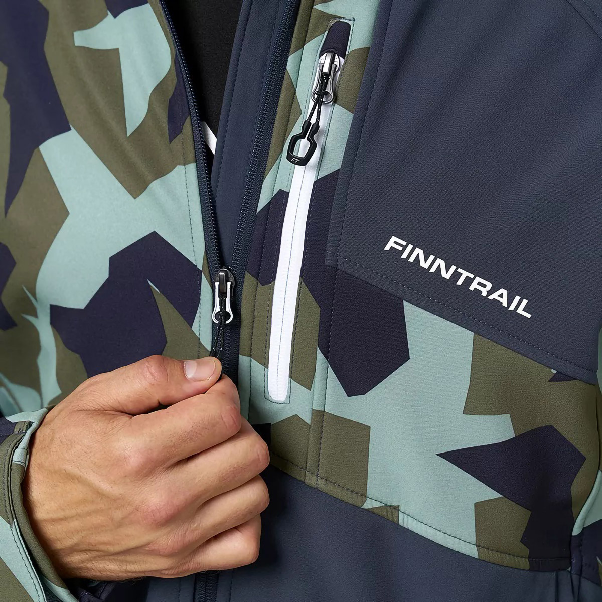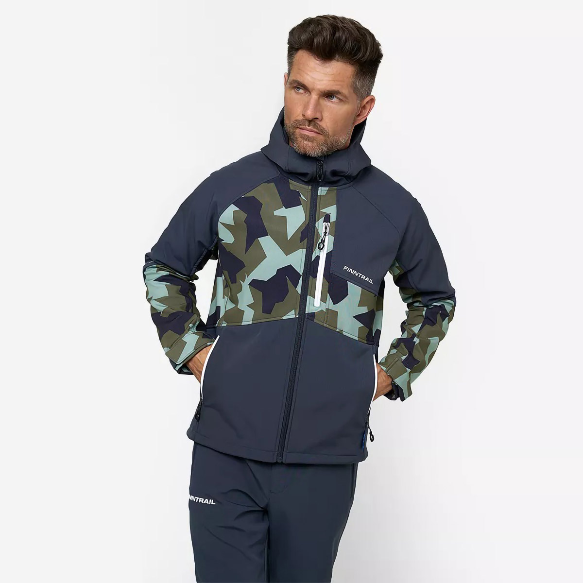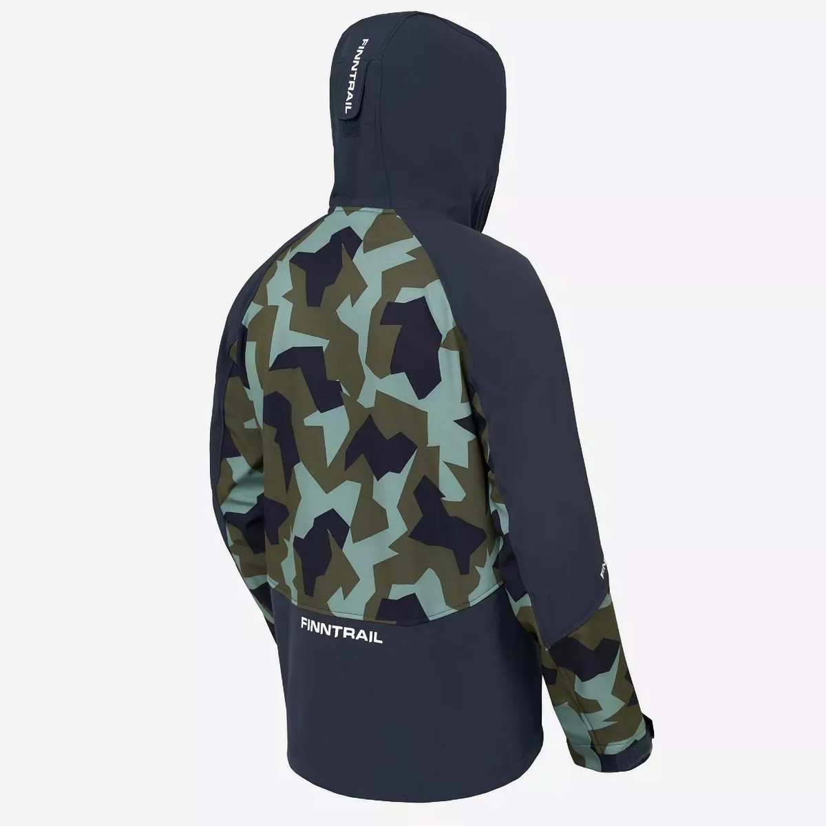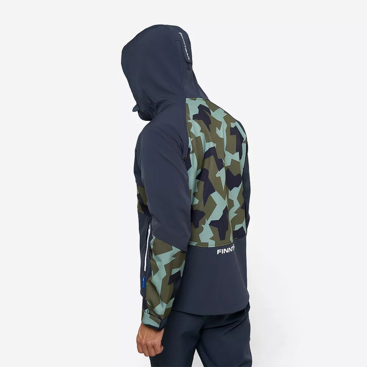 защищает от воды и ветра. Структура ткани позволяет сохранять комфорт в течение 24 часов во время небольшого дождя. Артикулированный, удлинённый крой с возможностью регулирования по объёму, учитывает анатомию человеческого тела и обеспечивает полную свободу движений. Внутренний слой куртки состоит из мягкого флиса, а на внешний нанесено водоотталкивающее покрытие. Функциональный дизайн модели объединяет в себе продуманные детали и классическую камуфляжную расцветку. Модель имеет три кармана на молнии: два боковых с тёплой подкладкой для согревания рук и один нагрудный. Высокий воротник-стойка переходит в капюшон, который плотно прилегает к голове. Для защиты от ветра верхняя часть куртки оснащена специальной планкой.