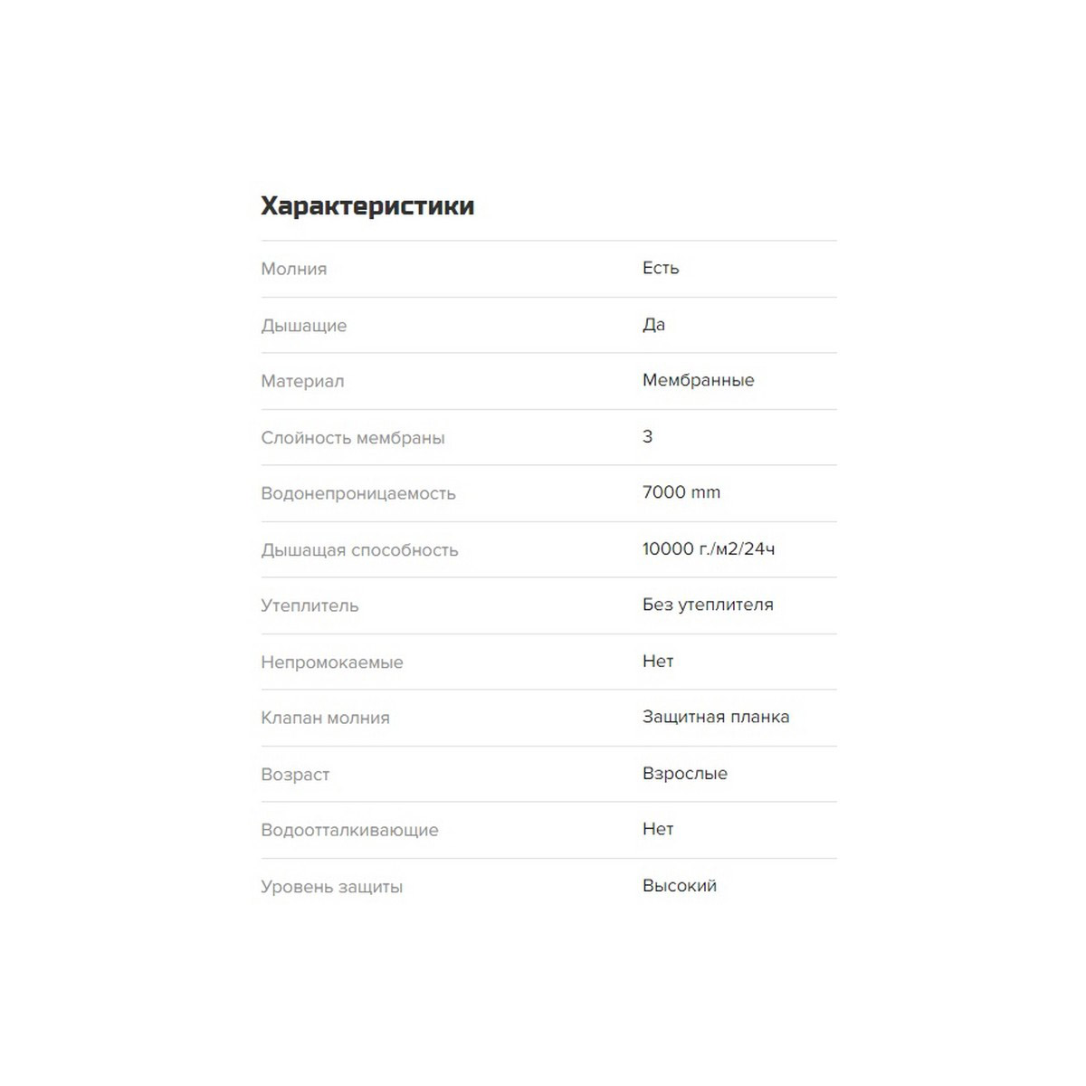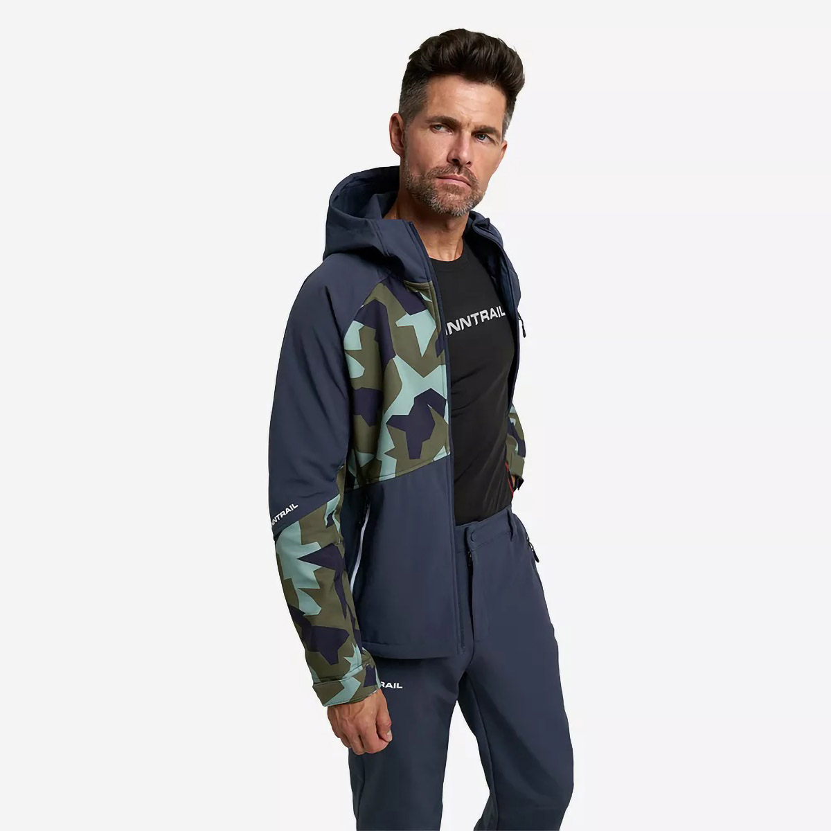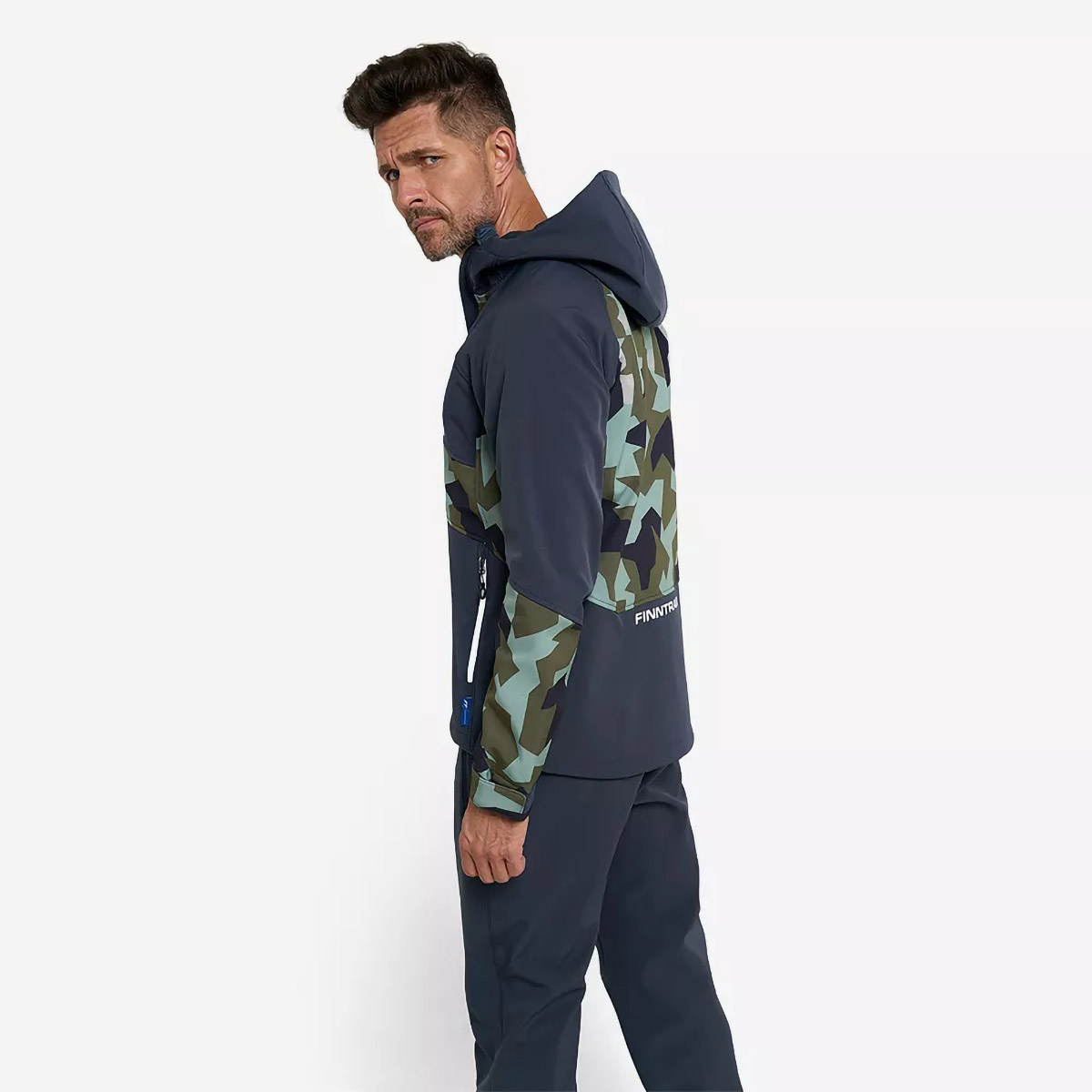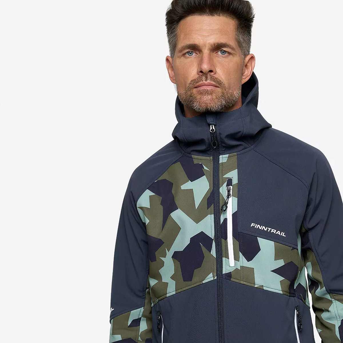 защищает от воды и ветра. Структура ткани позволяет сохранять комфорт в течение 24 часов во время небольшого дождя. Артикулированный, удлинённый крой с возможностью регулирования по объёму, учитывает анатомию человеческого тела и обеспечивает полную свободу движений. Внутренний слой куртки состоит из мягкого флиса, а на внешний нанесено водоотталкивающее покрытие. Функциональный дизайн модели объединяет в себе продуманные детали и классическую камуфляжную расцветку. Модель имеет три кармана на молнии: два боковых с тёплой подкладкой для согревания рук и один нагрудный. Высокий воротник-стойка переходит в капюшон, который плотно прилегает к голове. Для защиты от ветра верхняя часть куртки оснащена специальной планкой.
