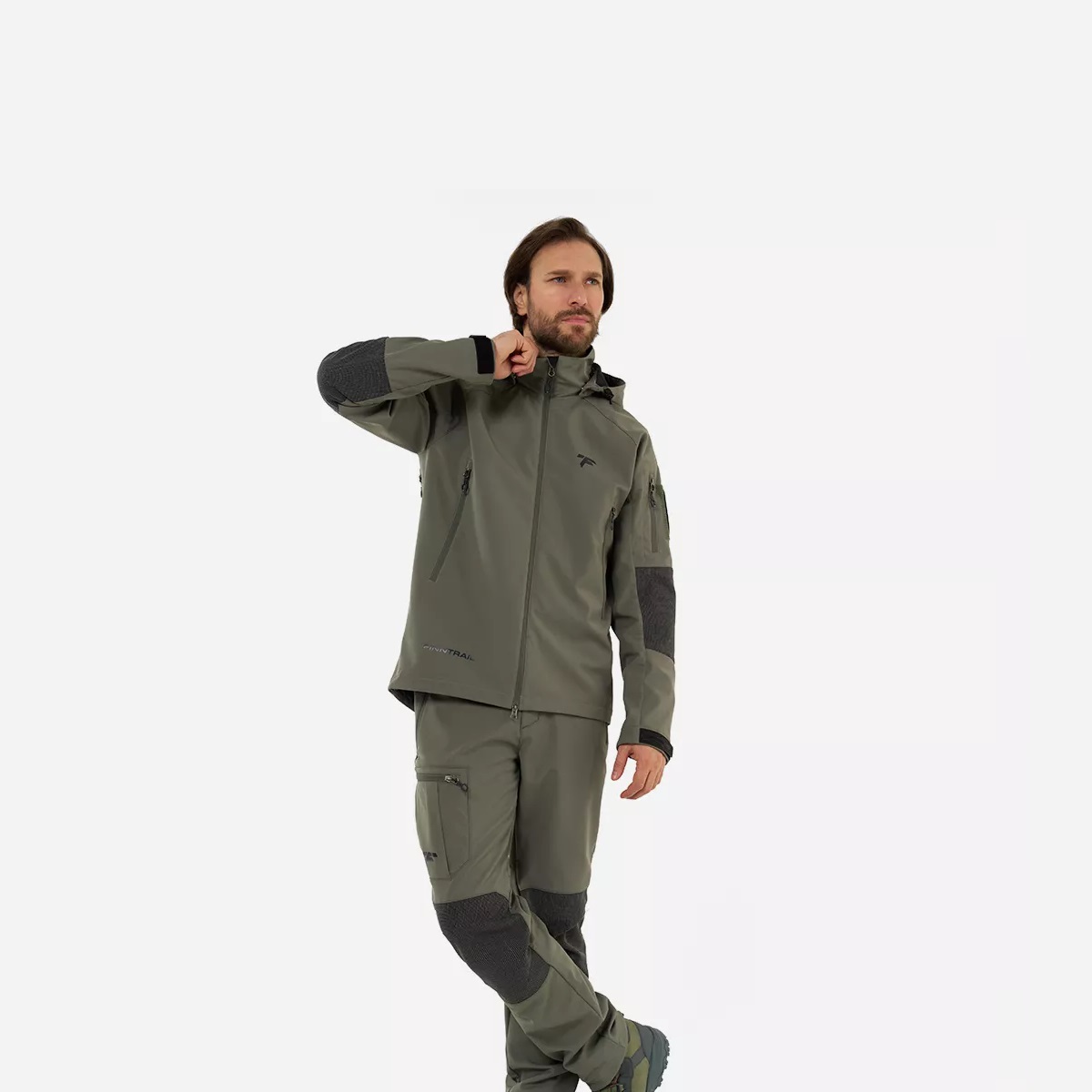 Трёхслойная ткань SoftShell с мембраной и показателями водонепроницаемости до 7 000 мм защищает от воды и ветра. Водоотталкивающее покрытие DWR предотвращает впитывание вязкой грязи и влаги, препятствуя появлению на поверхности следов от разводов. Внутренний слой из мягкого микрофлиса обеспечивает дополнительное тепло. Материал RIPSTOP в районе локтей увеличивает износостойкость. Артикулированный крой учитывает анатомическое строение человека и обеспечивает полную свободу движений. Функциональный дизайн модели объединяет в себе продуманные детали и оригинальный тёмно-серый цвет. Вентиляция в области подмышек контролирует теплообмен. Отстегивающийся и регулируемый капюшон позволяет настроить оптимальный объем. Удлинённая спинка дополнительно оберегает поясницу от холода. Центральная молния с планкой в верхней части и резиновые застёжки на рукаве надёжно защищают от сильного ветра.