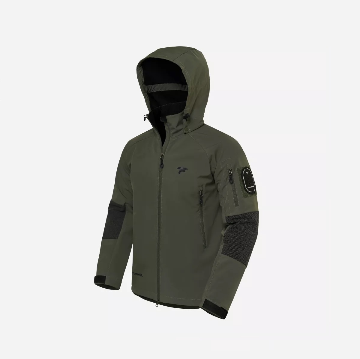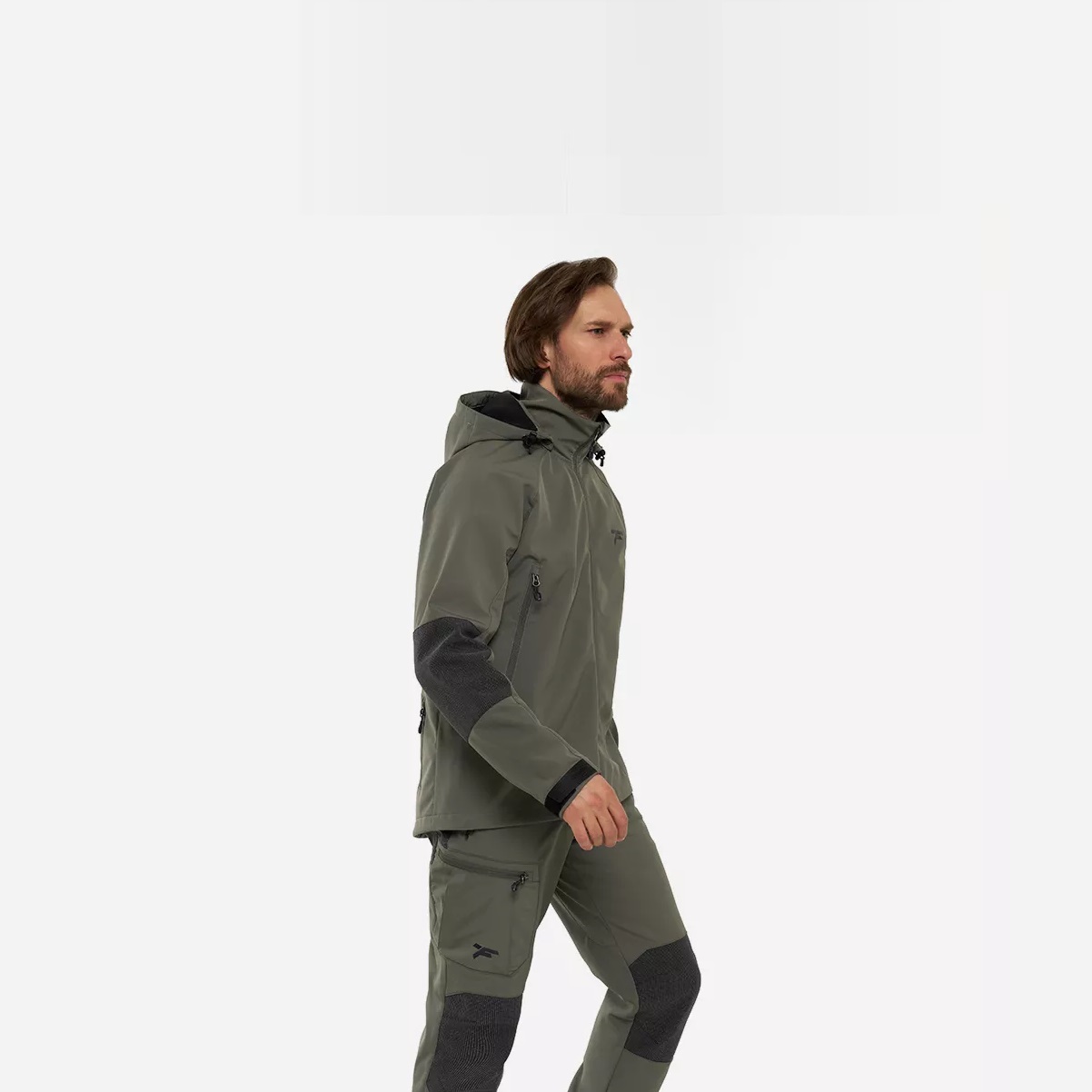 Трёхслойная ткань SoftShell с мембраной и показателями водонепроницаемости до 7 000 мм защищает от воды и ветра. Водоотталкивающее покрытие DWR предотвращает впитывание вязкой грязи и влаги, препятствуя появлению на поверхности следов от разводов. Внутренний слой из мягкого микрофлиса обеспечивает дополнительное тепло. Материал RIPSTOP в районе локтей увеличивает износостойкость. Артикулированный крой учитывает анатомическое строение человека и обеспечивает полную свободу движений. Функциональный дизайн модели объединяет в себе продуманные детали и оригинальный тёмно-серый цвет. Вентиляция в области подмышек контролирует теплообмен. Отстегивающийся и регулируемый капюшон позволяет настроить оптимальный объем. Удлинённая спинка дополнительно оберегает поясницу от холода. Центральная молния с планкой в верхней части и резиновые застёжки на рукаве надёжно защищают от сильного ветра.