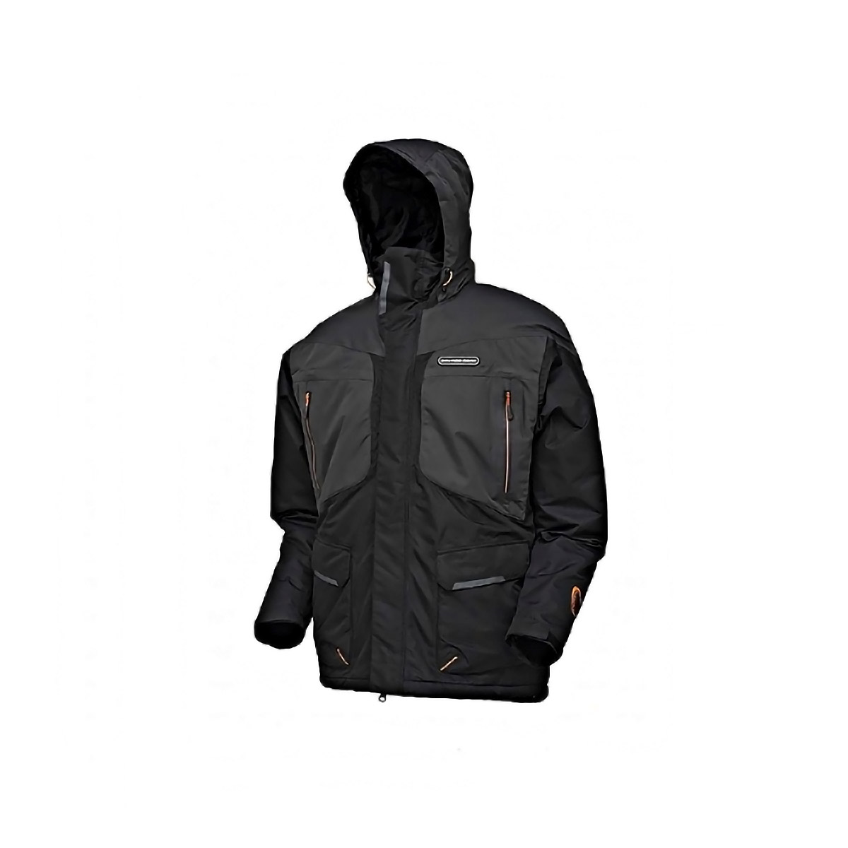 Капюшон несъёмный, с жёстким козырьком и регулировками по высоте и ширине — держит форму на ветру и не закрывает обзор. Основная двусторонняя молния закрыта двойной ветрозащитной планкой, низ и манжеты регулируются. Организация карманов рассчитана под рыбалку: 2 нагрудных на молнии, 2 нижних «бокса» с тёплыми карманами для рук на молнии и 1 внутренний на молнии — всё, что нужно, всегда под рукой.
