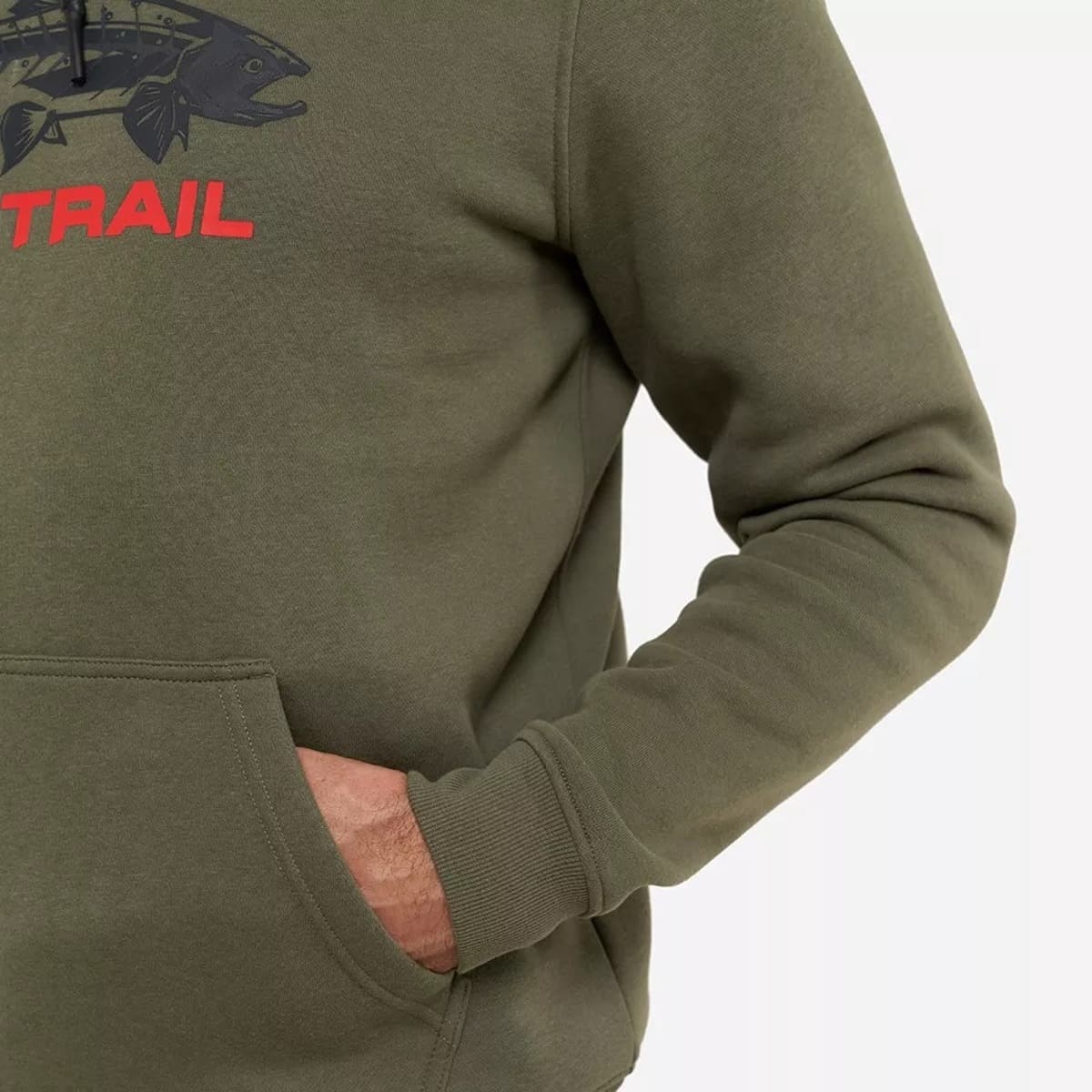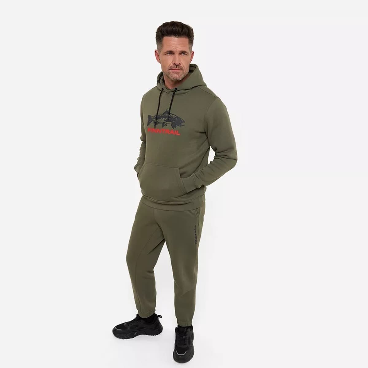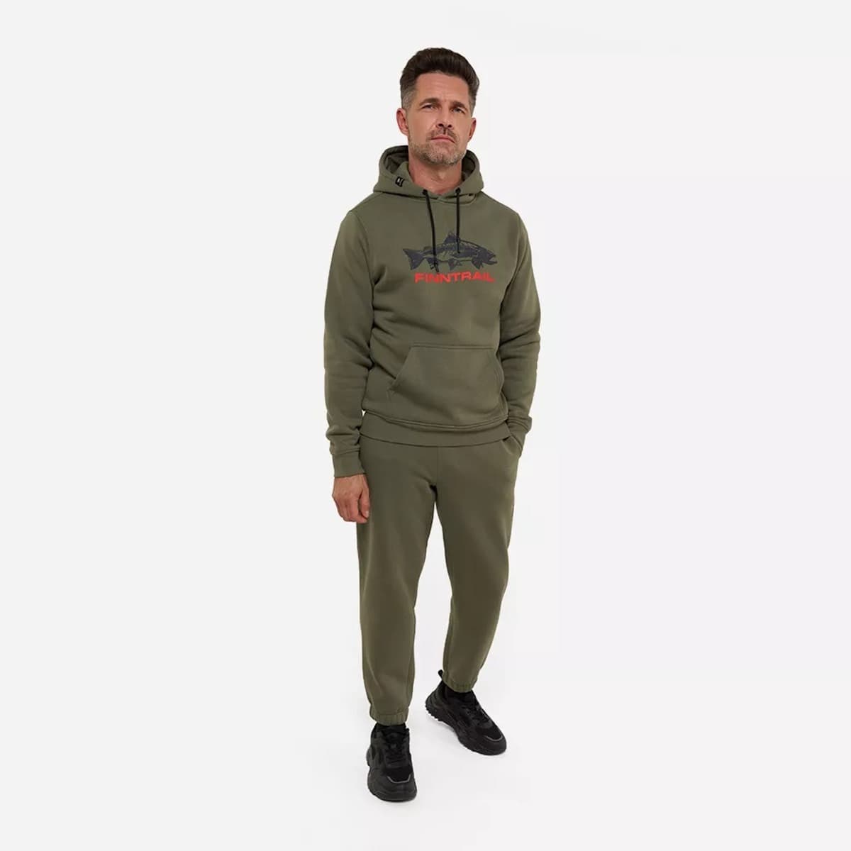 Плотный и прочный футер надёжно защищает от ветра и холода. Пушистый начёс (295 г/м2) на внутреннем слое обеспечивает дополнительное тепло, придавая ощущение мягкости и комфорта. Функциональный дизайн модели объединяет в себе продуманные детали, цвет хаки, оригинальный принт с рыбой и ярким логотипом FINNTRAIL, а также акцент в виде жаккардового флажка с уникальными дизайном. Объемный силуэт позволяет надевать толстовку поверх футболок или рубашек. Благодаря удобным накладным карманам личные вещи будут всегда находиться под рукой. Капюшон с подкладкой и регулируемым шнурком обеспечивает надёжную фиксацию на голове и не сползает во время движения. Эластичный пояс и манжеты толстовки создают максимально комфортную посадку.