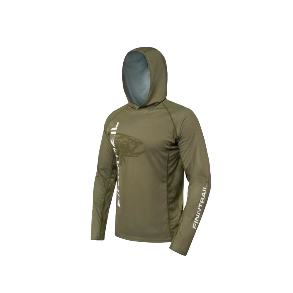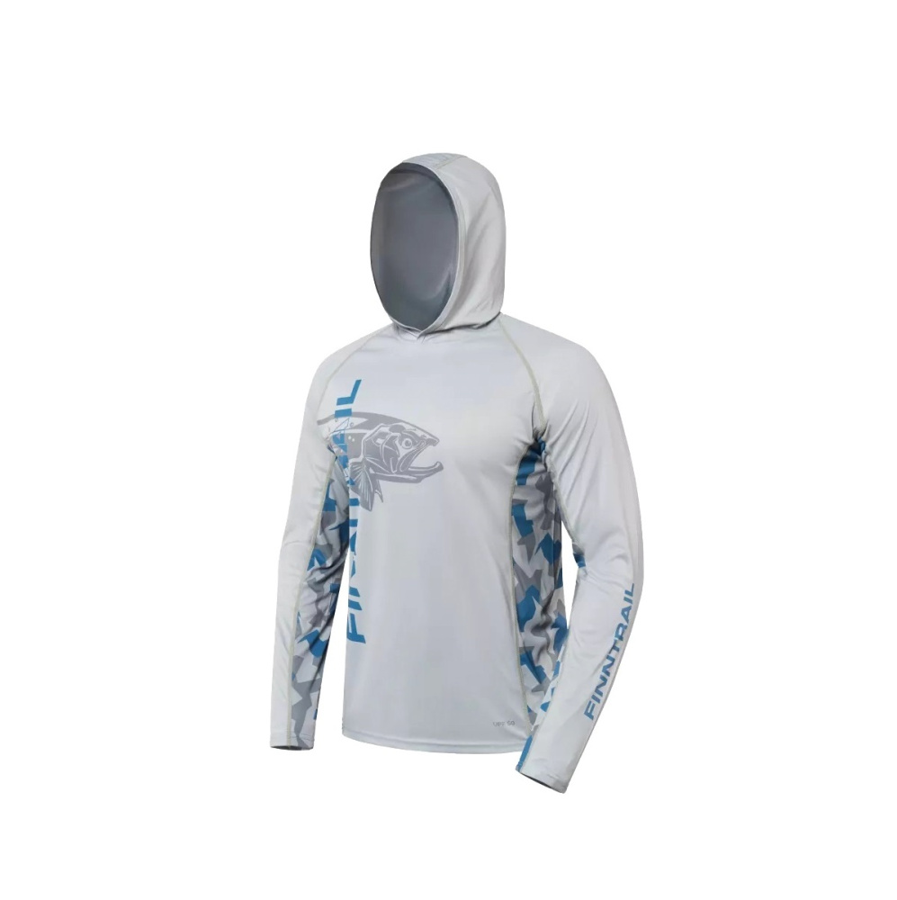укроет от воздействия вредного солнечного излучения. Капюшон создаст дополнительную защиту от ветра и обеспечит комфортную посадку. Материал лонгслива изготовлен с использованием технологии от насекомых, а также обработан антибактериальным покрытием, препятствующим появлению неприятных запахов. Дизайн модели сочетает в себе классический серый цвет с элементами камуфляжа, уникальный принт для поклонников рыбалки с фирменным логотипом FINNTRAIL и удобные, продуманные детали. Например, под манжетой предусмотрена эластичная петля для большого пальца, которая позволяет фиксировать рукав на запястье, предотвращая его подъем или скатывание во время активных движений.