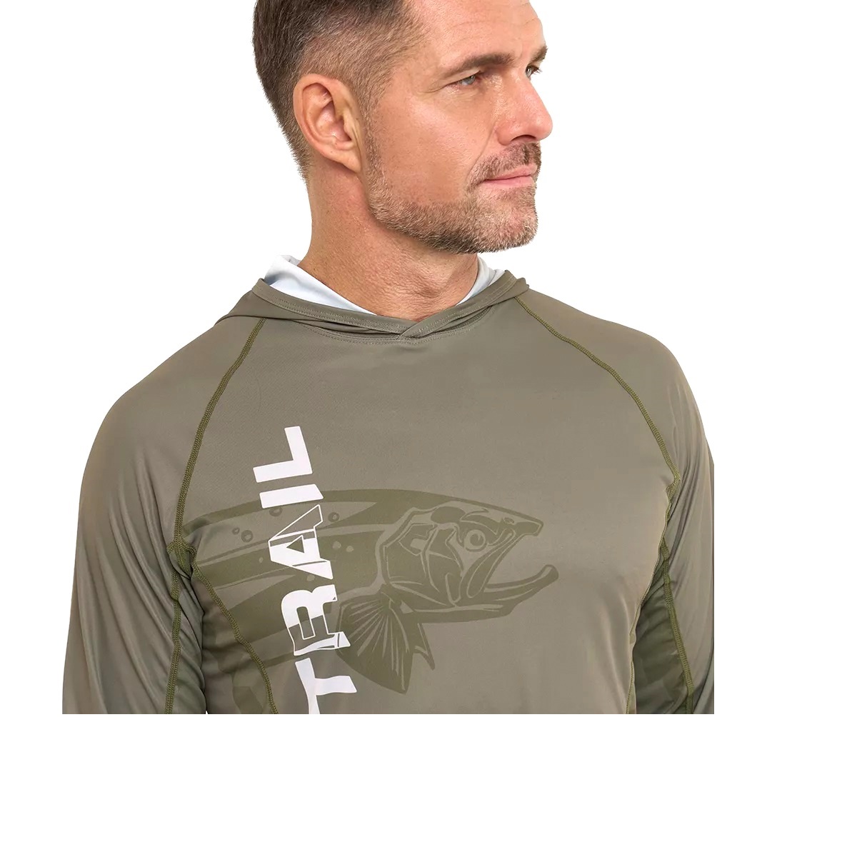 Дышащая и быстросохнущая ткань с коэффициентом защиты от ультрафиолета UPF 50 укроет от воздействия вредного солнечного излучения. Капюшон создаст дополнительную защиту от ветра и обеспечит комфортную посадку. Материал лонгслива изготовлен с использованием технологии от насекомых, а также обработан антибактериальным покрытием, препятствующим появлению неприятных запахов. Дизайн модели сочетает в себе классический цвет хаки с элементами камуфляжа, уникальный принт для поклонников рыбалки с фирменным логотипом FINNTRAIL и удобные, продуманные детали. Например, под манжетой предусмотрена эластичная петля для большого пальца, которая позволяет фиксировать рукав на запястье, предотвращая его подъем или скатывание во время активных движений.