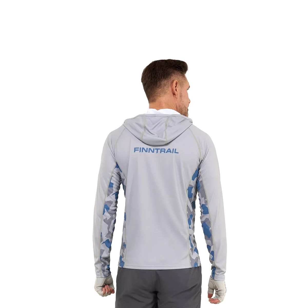 укроет от воздействия вредного солнечного излучения. Капюшон создаст дополнительную защиту от ветра и обеспечит комфортную посадку. Материал лонгслива изготовлен с использованием технологии от насекомых, а также обработан антибактериальным покрытием, препятствующим появлению неприятных запахов. Дизайн модели сочетает в себе классический серый цвет с элементами камуфляжа, уникальный принт для поклонников рыбалки с фирменным логотипом FINNTRAIL и удобные, продуманные детали. Например, под манжетой предусмотрена эластичная петля для большого пальца, которая позволяет фиксировать рукав на запястье, предотвращая его подъем или скатывание во время активных движений.