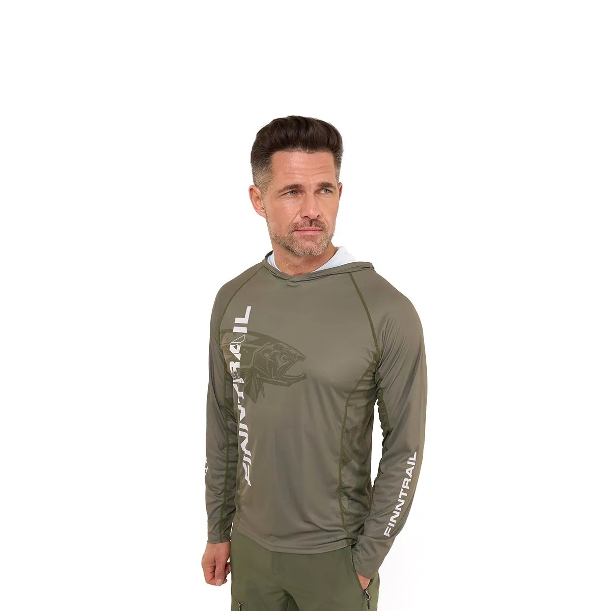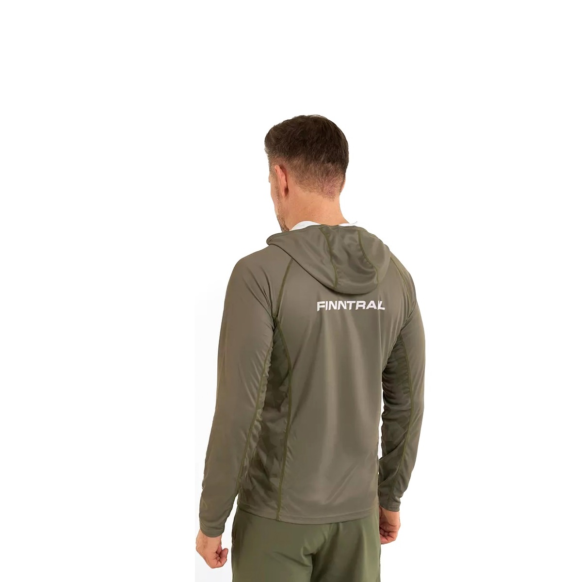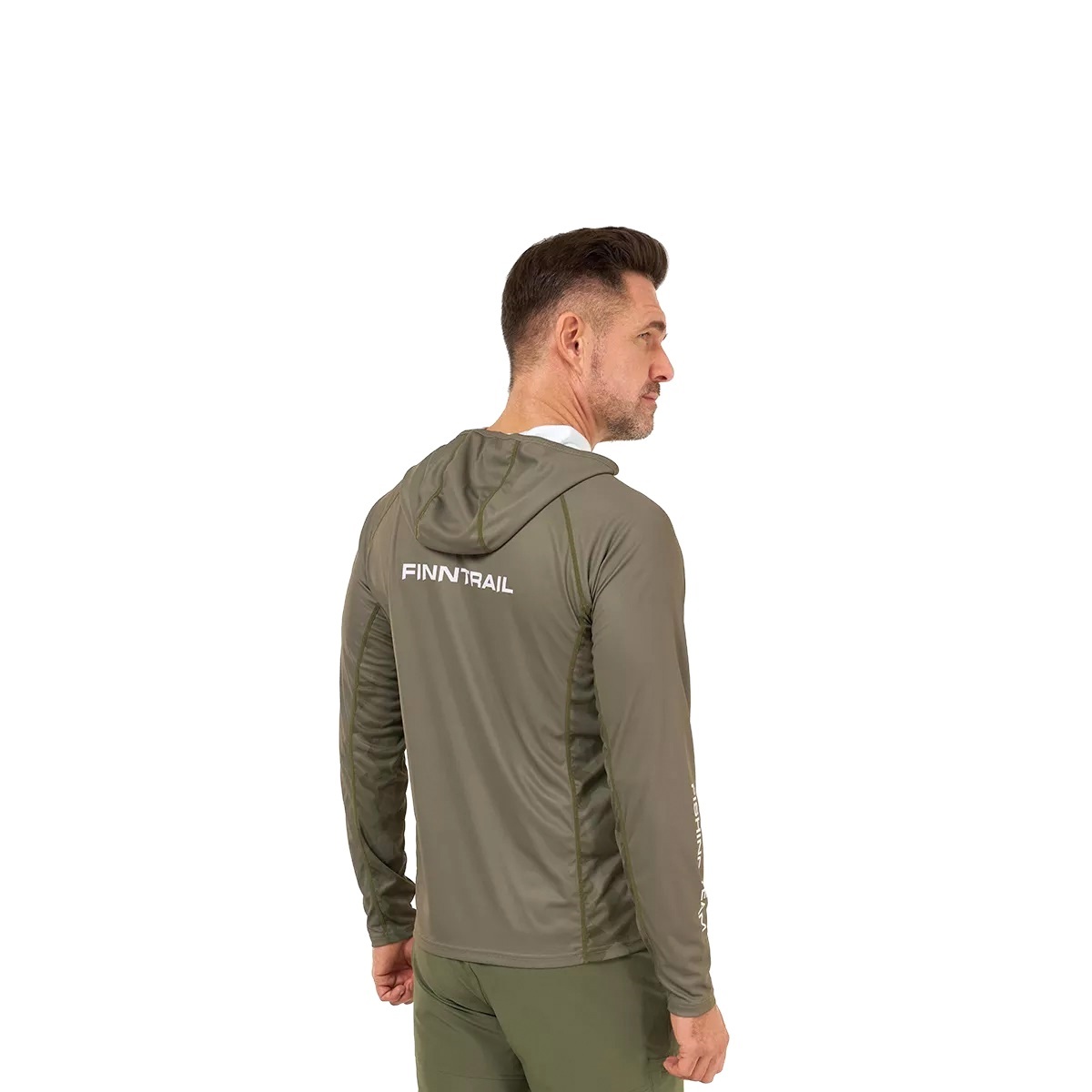 Дышащая и быстросохнущая ткань с коэффициентом защиты от ультрафиолета UPF 50 укроет от воздействия вредного солнечного излучения. Капюшон создаст дополнительную защиту от ветра и обеспечит комфортную посадку. Материал лонгслива изготовлен с использованием технологии от насекомых, а также обработан антибактериальным покрытием, препятствующим появлению неприятных запахов. Дизайн модели сочетает в себе классический цвет хаки с элементами камуфляжа, уникальный принт для поклонников рыбалки с фирменным логотипом FINNTRAIL и удобные, продуманные детали. Например, под манжетой предусмотрена эластичная петля для большого пальца, которая позволяет фиксировать рукав на запястье, предотвращая его подъем или скатывание во время активных движений.