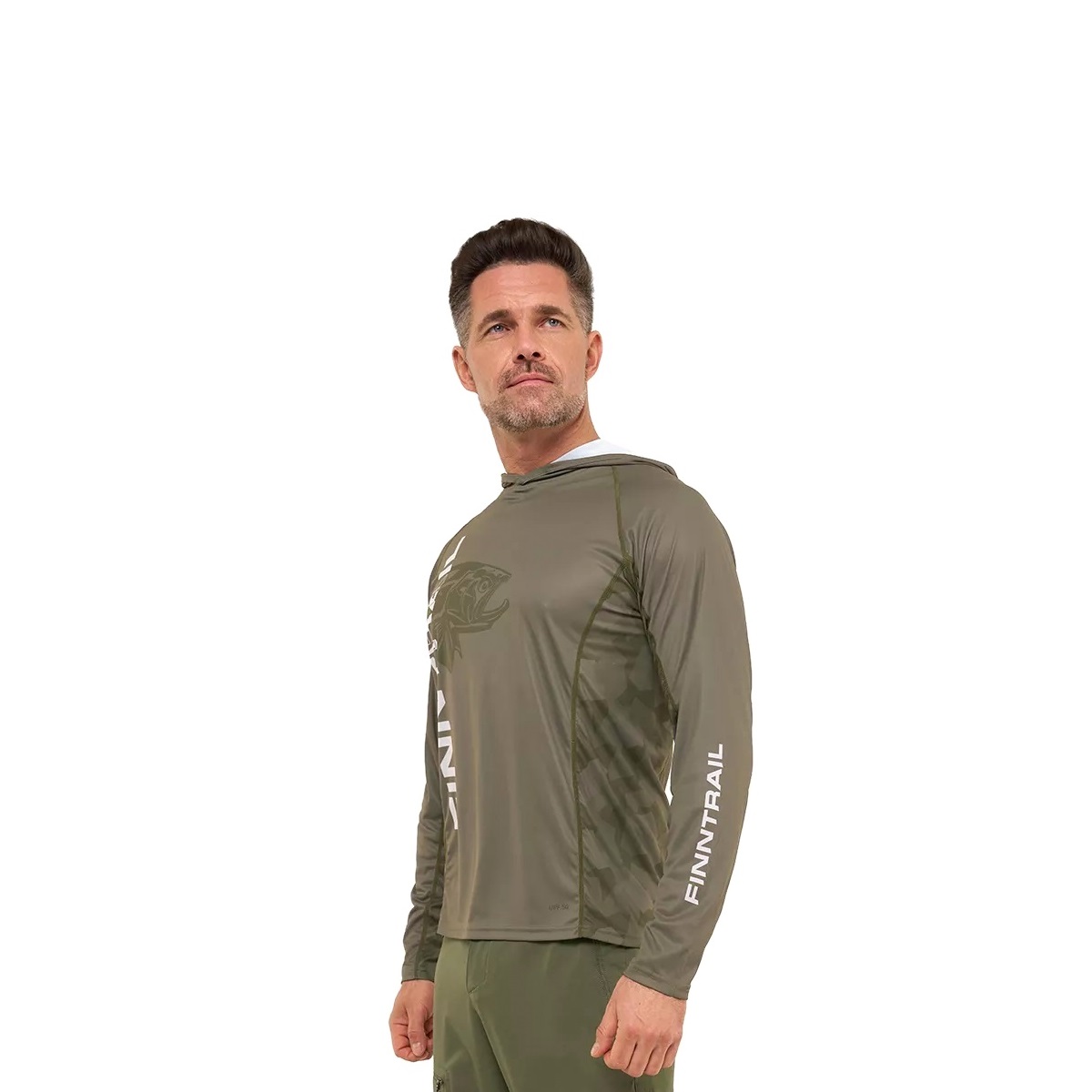 Дышащая и быстросохнущая ткань с коэффициентом защиты от ультрафиолета UPF 50 укроет от воздействия вредного солнечного излучения. Капюшон создаст дополнительную защиту от ветра и обеспечит комфортную посадку. Материал лонгслива изготовлен с использованием технологии от насекомых, а также обработан антибактериальным покрытием, препятствующим появлению неприятных запахов. Дизайн модели сочетает в себе классический цвет хаки с элементами камуфляжа, уникальный принт для поклонников рыбалки с фирменным логотипом FINNTRAIL и удобные, продуманные детали. Например, под манжетой предусмотрена эластичная петля для большого пальца, которая позволяет фиксировать рукав на запястье, предотвращая его подъем или скатывание во время активных движений.