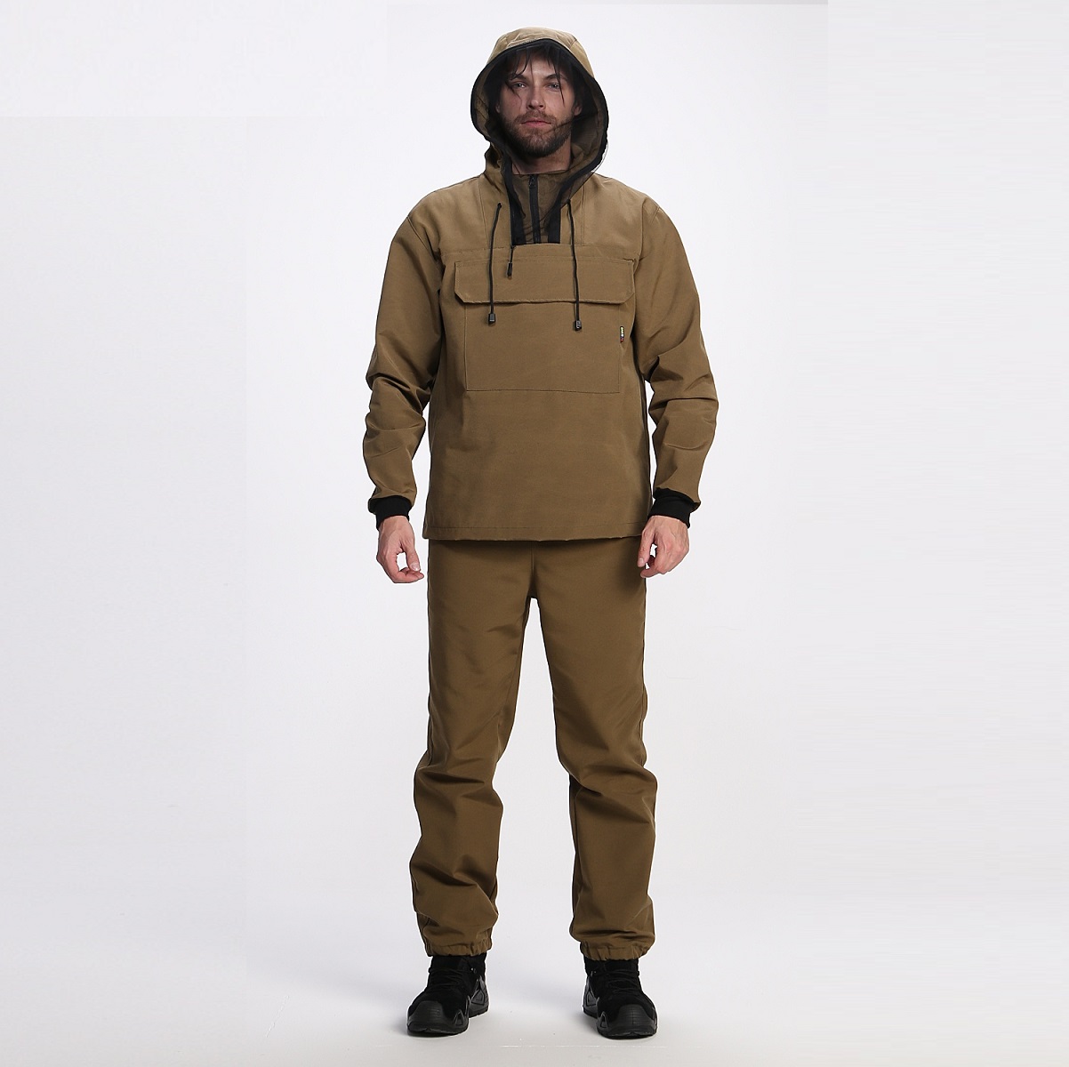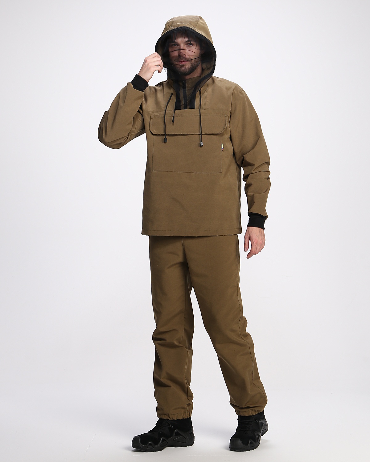 На куртке располагается дополнительный карман для сетки, которая при необходимости пристегивается к капюшону.