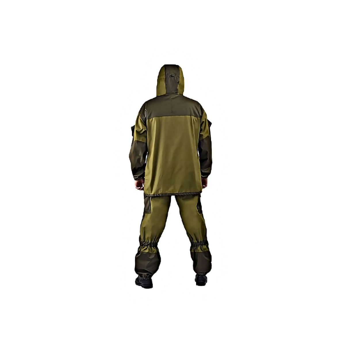 Внизу с двумя косыми прорезными карманами на клапане, объемные карманы на рукавах. Брюки свободного покроя, низ на резинке, застежка гульфик на пуговицах, пояс на широкой прошитой резинке, на поясе шлёвки для ремня. К поясу крепятся съёмные брители-подтяжки на пуговицах, спереди два боковых прорезных кармана на пуговицах, сзади два накладных кармана на пуговицах, на уровне колена два боковых накладных кармана на липучках, пылезащитная юбка из бязи по низу брюк на резинке.