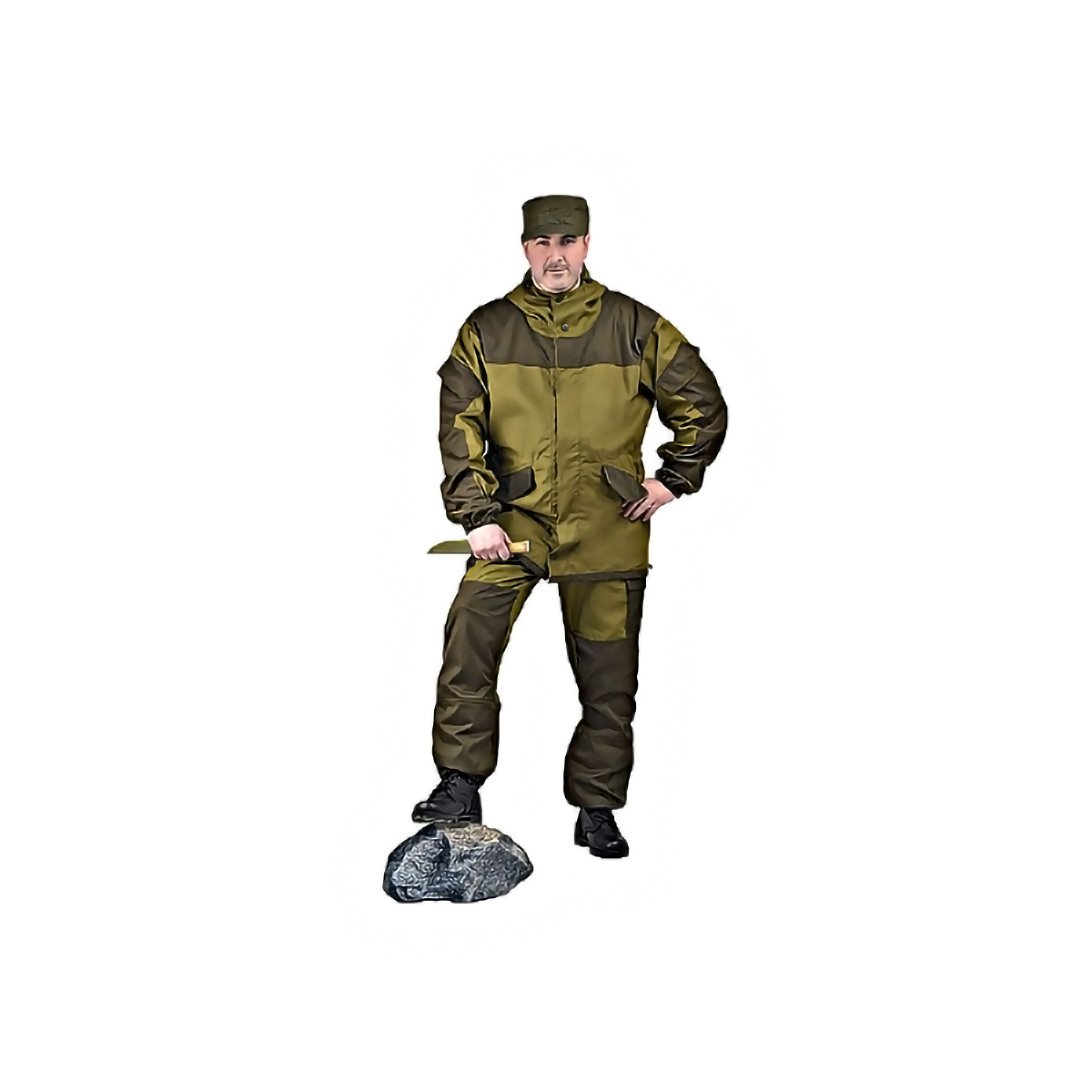 Внизу с двумя косыми прорезными карманами на клапане, объемные карманы на рукавах. Брюки свободного покроя, низ на резинке, застежка гульфик на пуговицах, пояс на широкой прошитой резинке, на поясе шлёвки для ремня. К поясу крепятся съёмные брители-подтяжки на пуговицах, спереди два боковых прорезных кармана на пуговицах, сзади два накладных кармана на пуговицах, на уровне колена два боковых накладных кармана на липучках, пылезащитная юбка из бязи по низу брюк на резинке.