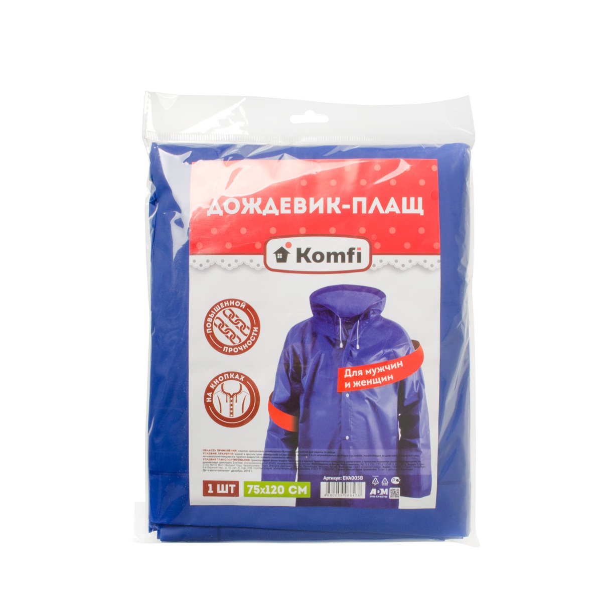 Дождевик Komfi с капюшоном, на кнопках 75х120см (EVA) синий (EVA005В)