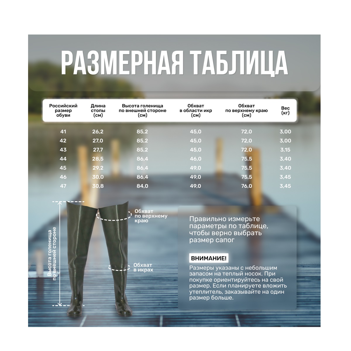 Голенище в рыбацких сапогах выполнено из тонкого, прочного и водонепроницаемого нейлона с ПВХ-покрытием плотностью 0,390 г/м2.