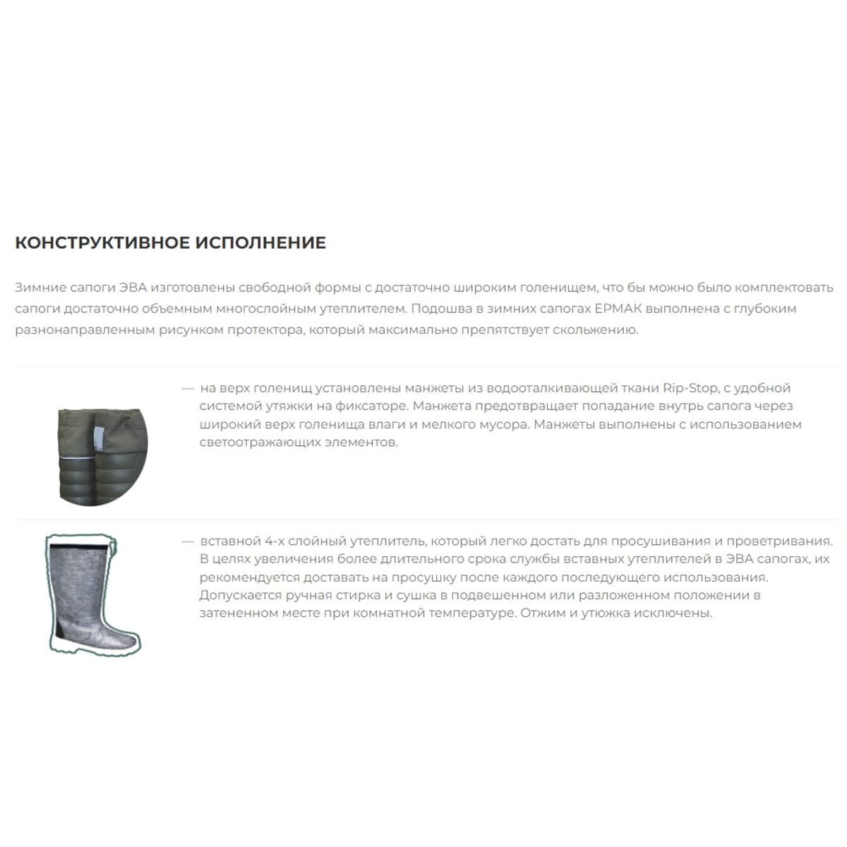 Сапоги из ЭВА для зимней рыбалки серии ЕРМАК укомплектованы вставным утеплителем, состоящим из 4 основных слоев, и обеспечивающим сапогам температурный предел эксплуатации до -40С*