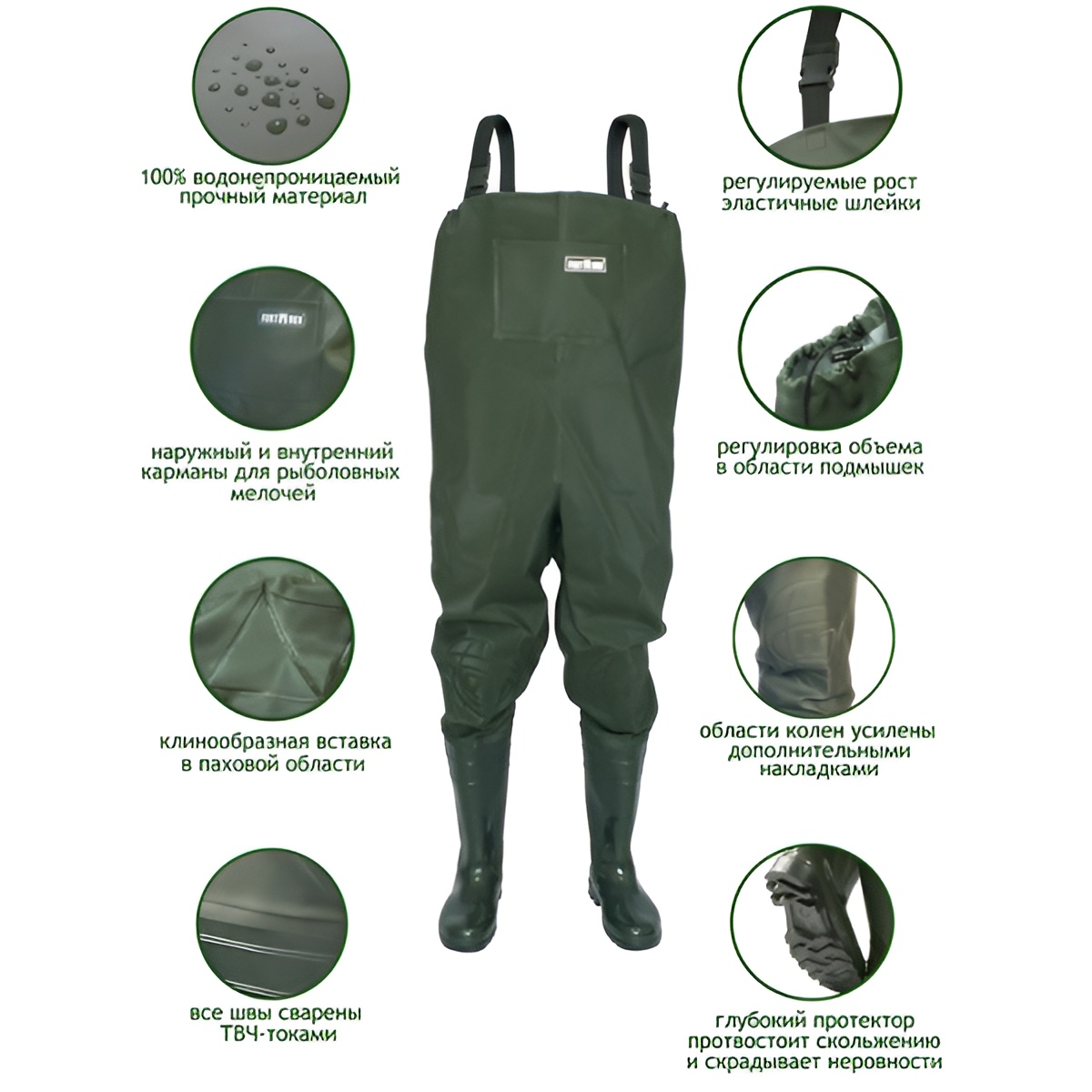 Швы кроя и соединительный шов верхней части с сапогами сварены высокочастотным током. Технология сварки ТВЧ сплавляет полимерные материалы в единый монолитный материал, что гарантирует отсутствие протекания воды по всей длине изделия.