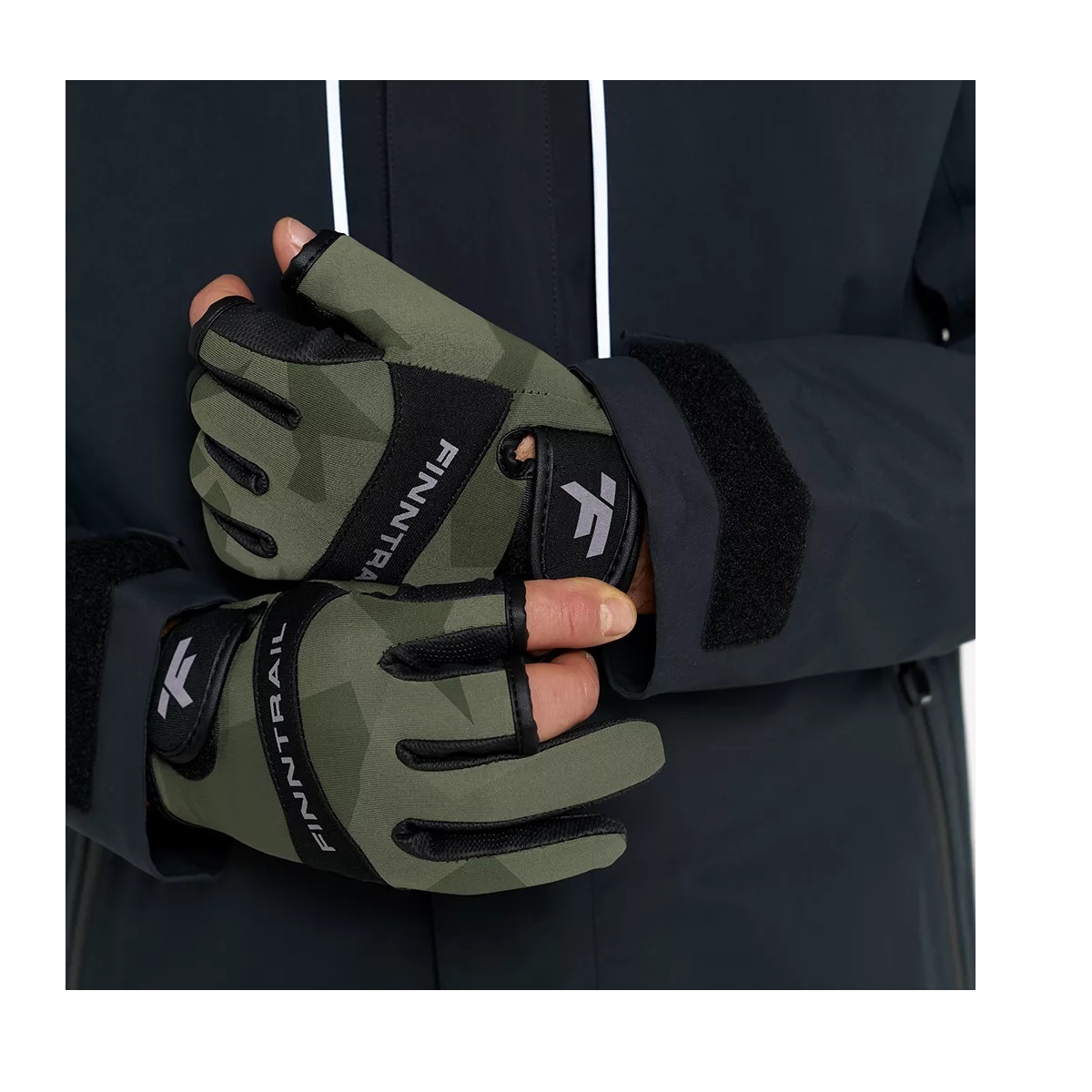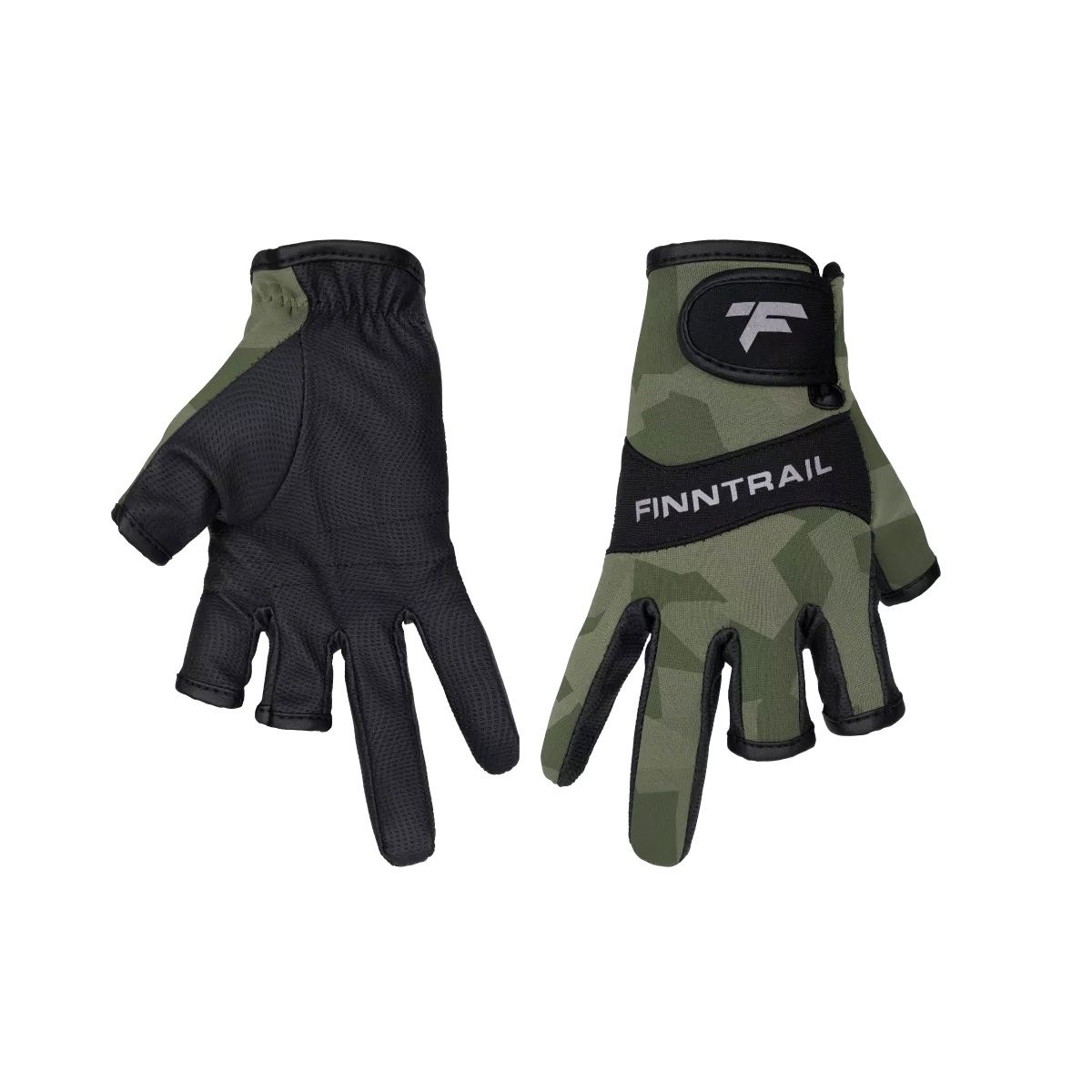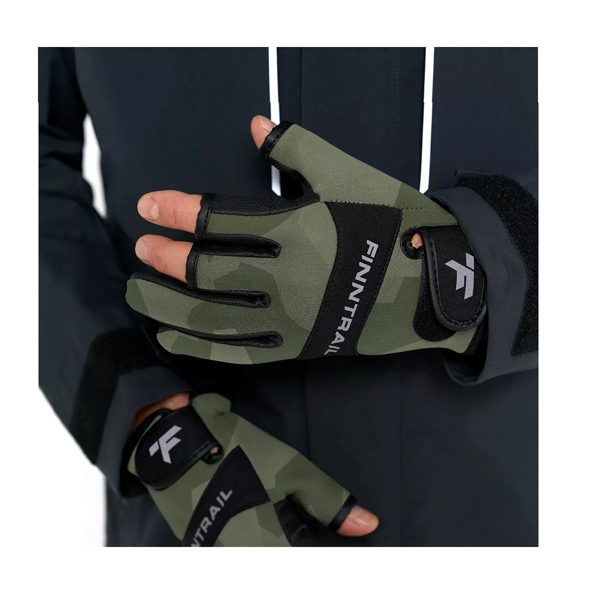 Внешний слой из неопрена надёжно защищает от воды и солнечных лучей. Искусственная кожа в районе ладони повышает износостойкость, сохраняя долговечность при интенсивном использовании. Данный материал легко моется, обеспечивает хорошую тактильность и чувствительность. Артикулированный крой создаёт полную свободу движений. Функциональный дизайн модели объединяет в себе продуманные детали и оригинальную камуфляжную расцветку. Благодаря трём открытым пальцам, сохраняется чувствительность и моторика, что позволяет легко и точно выполнять различные действия со снастями. Застежки на липучках в районе запястья обеспечивают комфортную и надежную посадку перчаток на руке, а также предотвращают их скольжение и смещение.