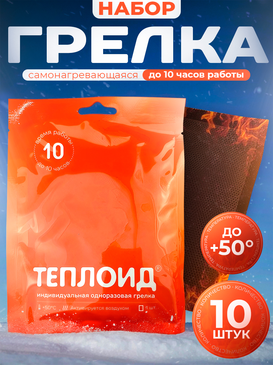 Одноразовая грелка Теплоид работает до 10 часов, не требует электричества, батареек или топлива. Она активируется при контакте с воздухом и выделяет стабильное тепло со средней температурой около 50 °C. Максимальный нагрев достигает 60 °C, что делает её идеальным решением для зимнего отдыха и путешествий.