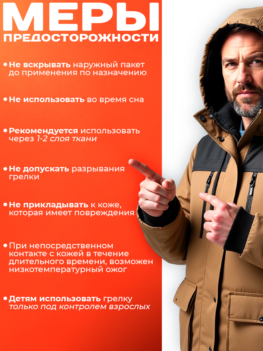 Используйте грелку для рук, ног, тела, обуви или одежды — где нужно быстрое и надёжное тепло.
