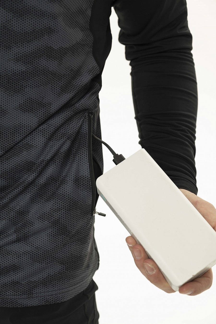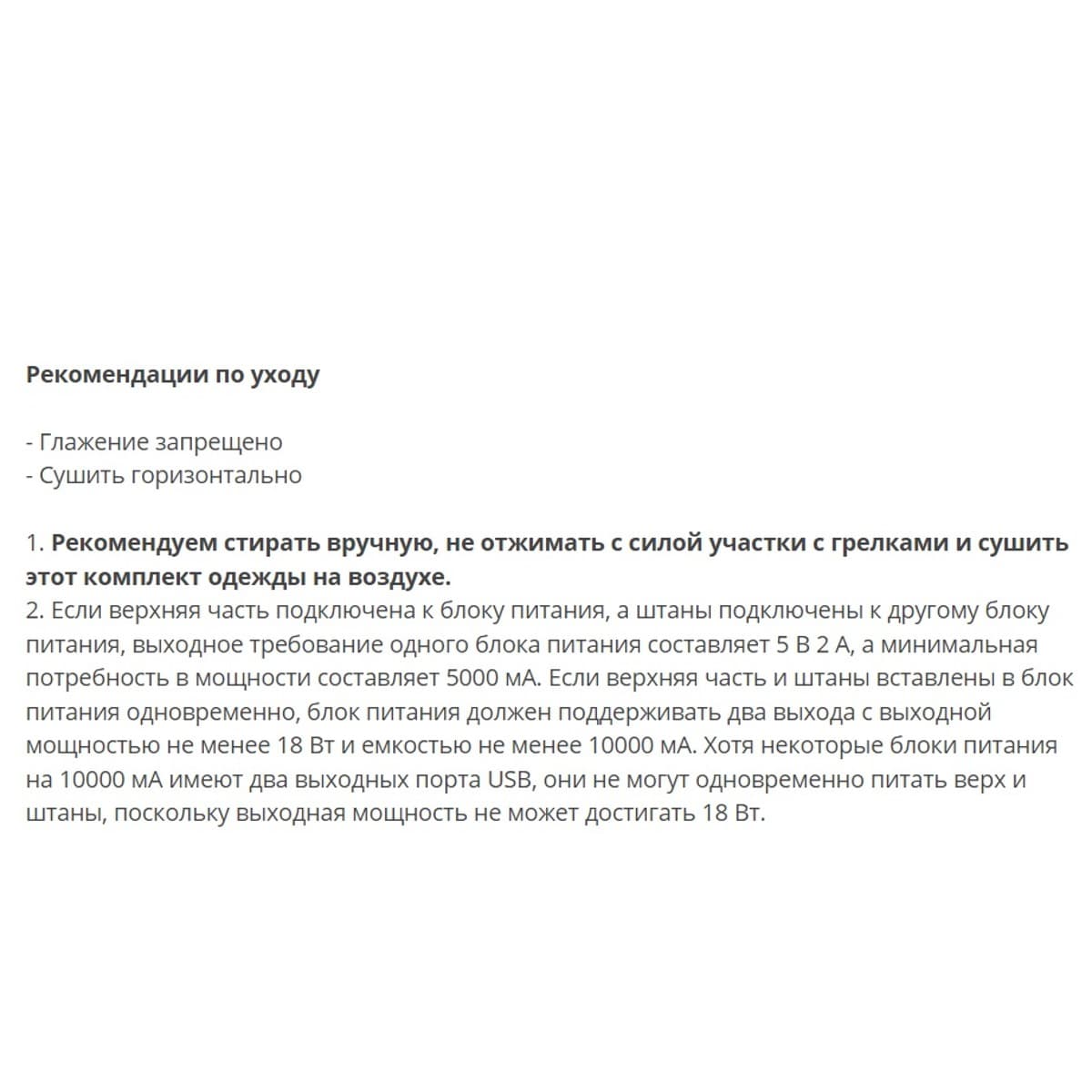 Модель имеет три режима обогрева, каждый из которых обозначается цветовой индикацией кнопки включения. На модели предусмотрено раздельное подключение кофты и брюк, что позволяет добиться комфортной температуры в нужной зоне тела.