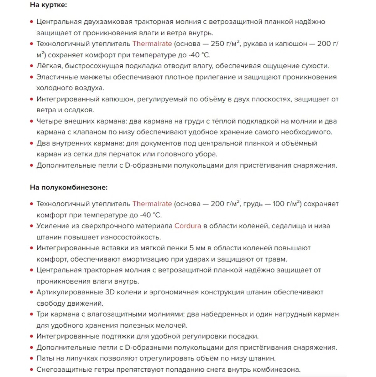 Технологичный утеплитель Thermalrate (основа — 200 г/м², грудь — 100 г/м²) сохраняет комфорт при температуре до -40 °С.
