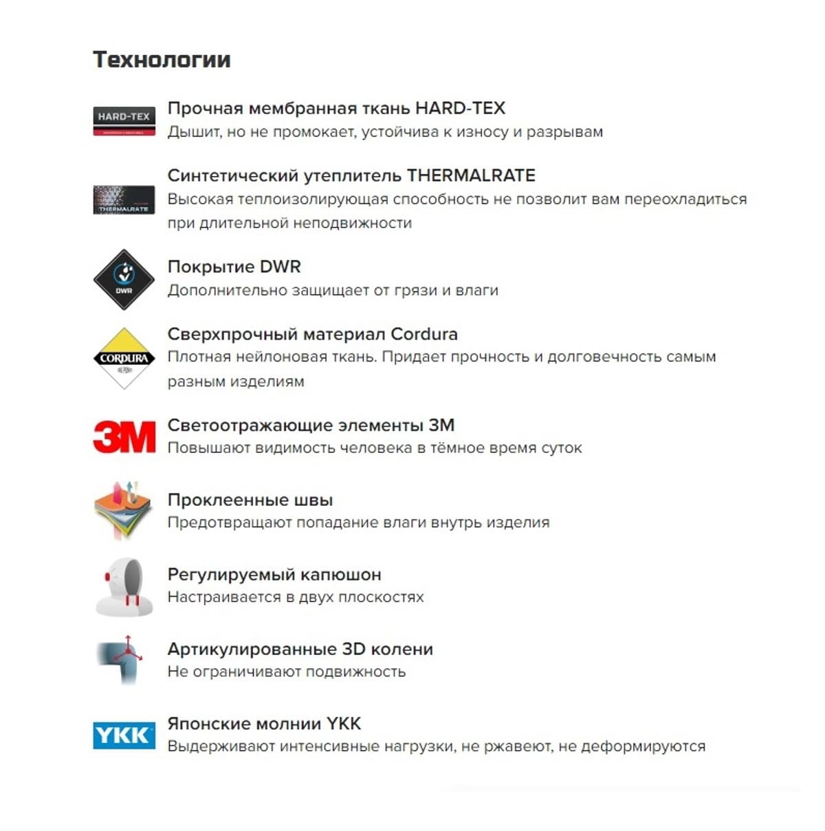 Износостойкий 2,5-слойный материал с мембраной HARD-TEX обеспечивает 100% защиту от мокрого снега, дождя и ветра.