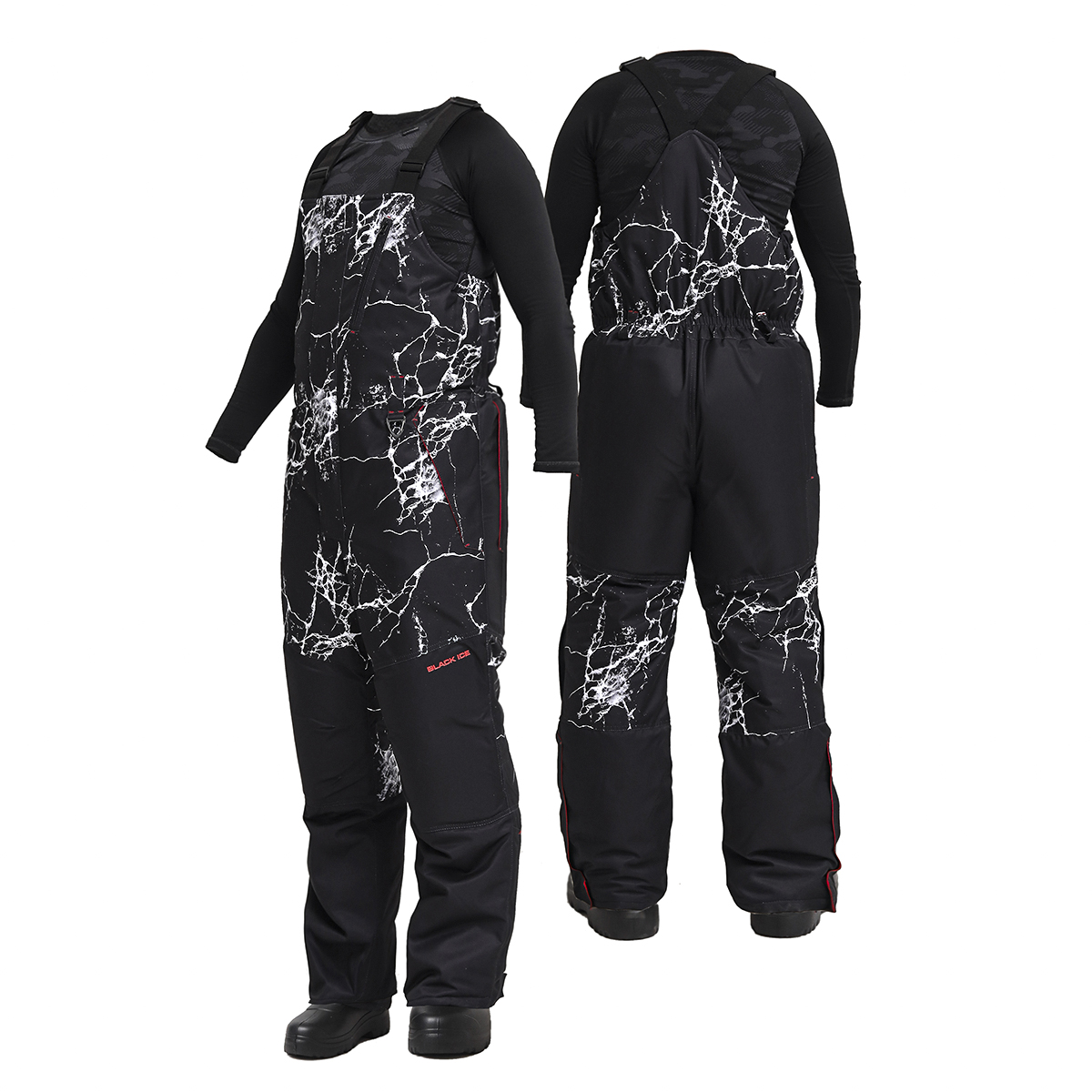 Полукомбинезон с центральной застёжкой на «молнию» с двумя бегунками и ветрозащитным пластроном с застёжкой на «Велкро», на бретелях. Бретели регулируются по длине и фиксируются с помощью двух - щелевых пряжек. Область коленей усилена фигурными накладками (черного цвета) и с 2-мя вытачками, по бокам накладки обработана застёжка на тесьму «молния». По поясу изделия располагаются 4 шлевки, на передних шлевках закреплены 2 металлических полукольца.На левой передней половине в области груди прорезной карман с обтачками и замком «молния». По нижним частям полукомбинезона со стороны подкладки снегозащитные муфты с латексной лентой по низу. Изолоновая пенка вставляется в наколенник и накладку ЗПП/К.