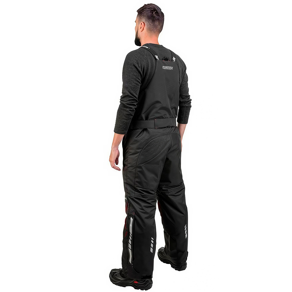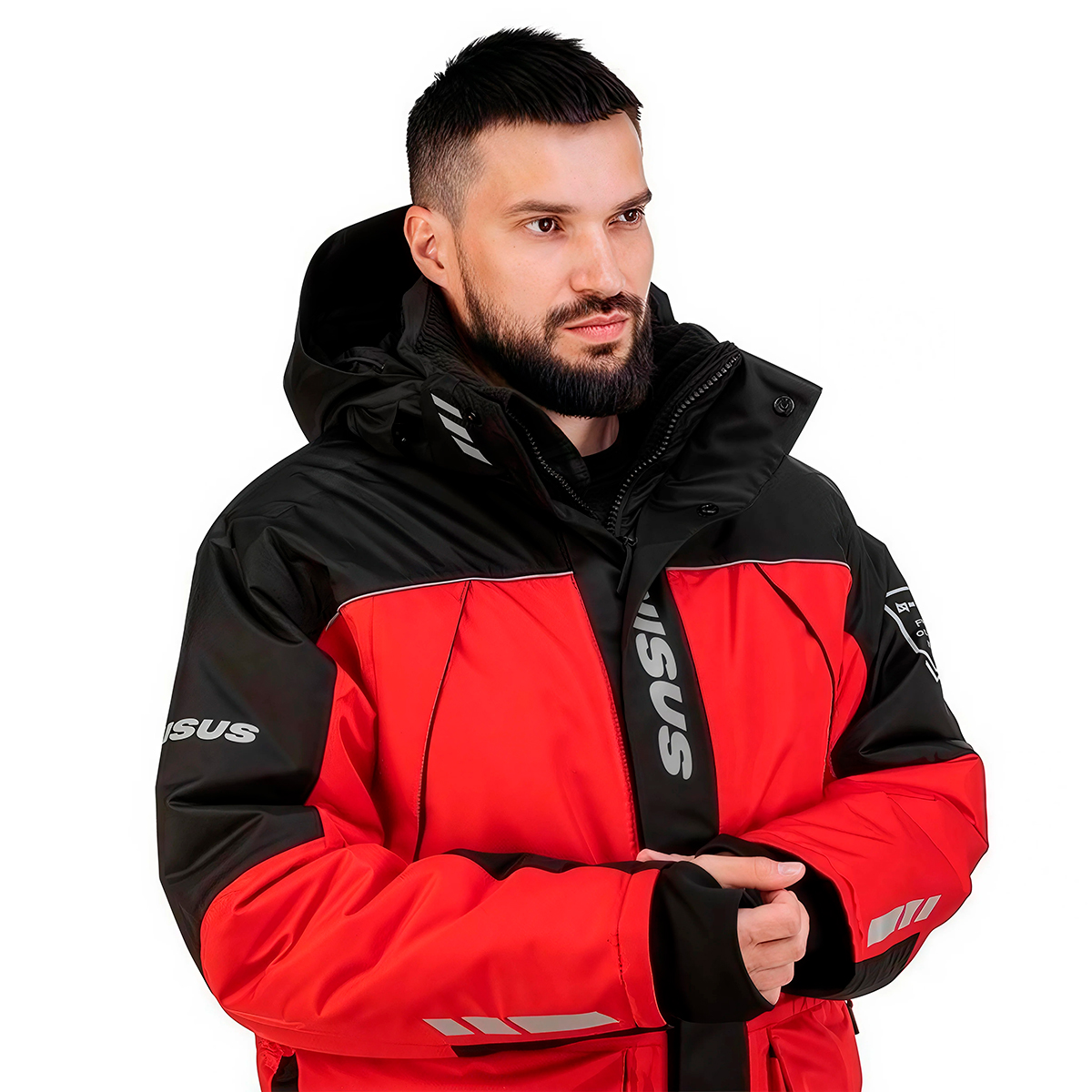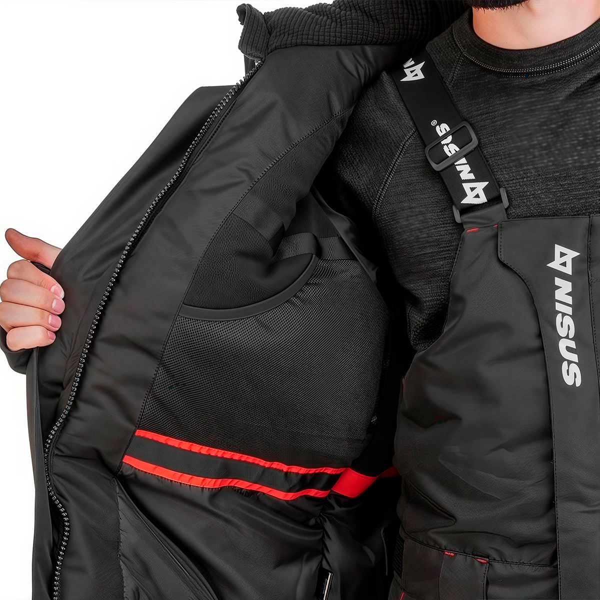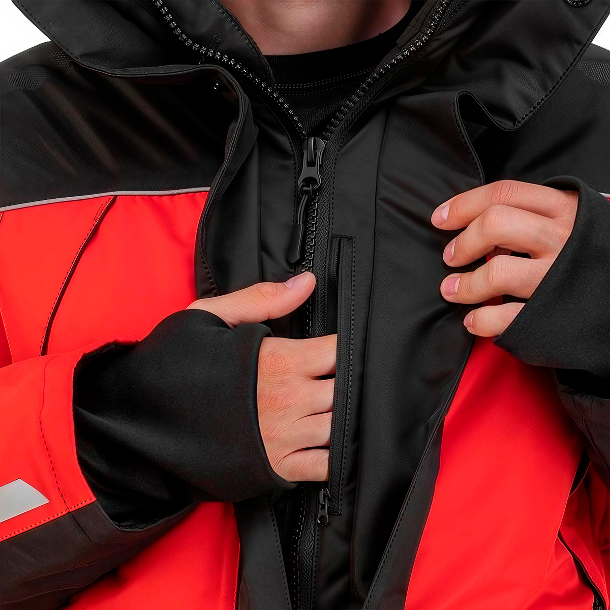 Костюм состоит из куртки и полукомбинезона, изготовлен из высокотехнологичных материалов с применением технологии проклеенных швов и предназначен для использования в сложных погодных условиях (мокрый снег, ветер, сильный мороз, метель). Яркие цвета (красный/черный) в сочетании со светоотражающими элементами способствуют лучшей заметности на льду и снегу, а также в других условиях плохой видимости, тем самым обеспечивая безопасность его обладателю.