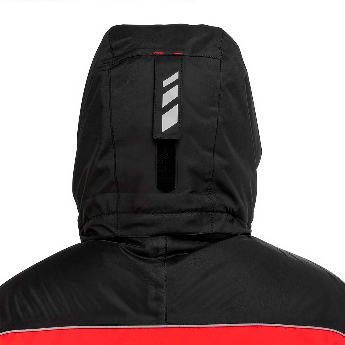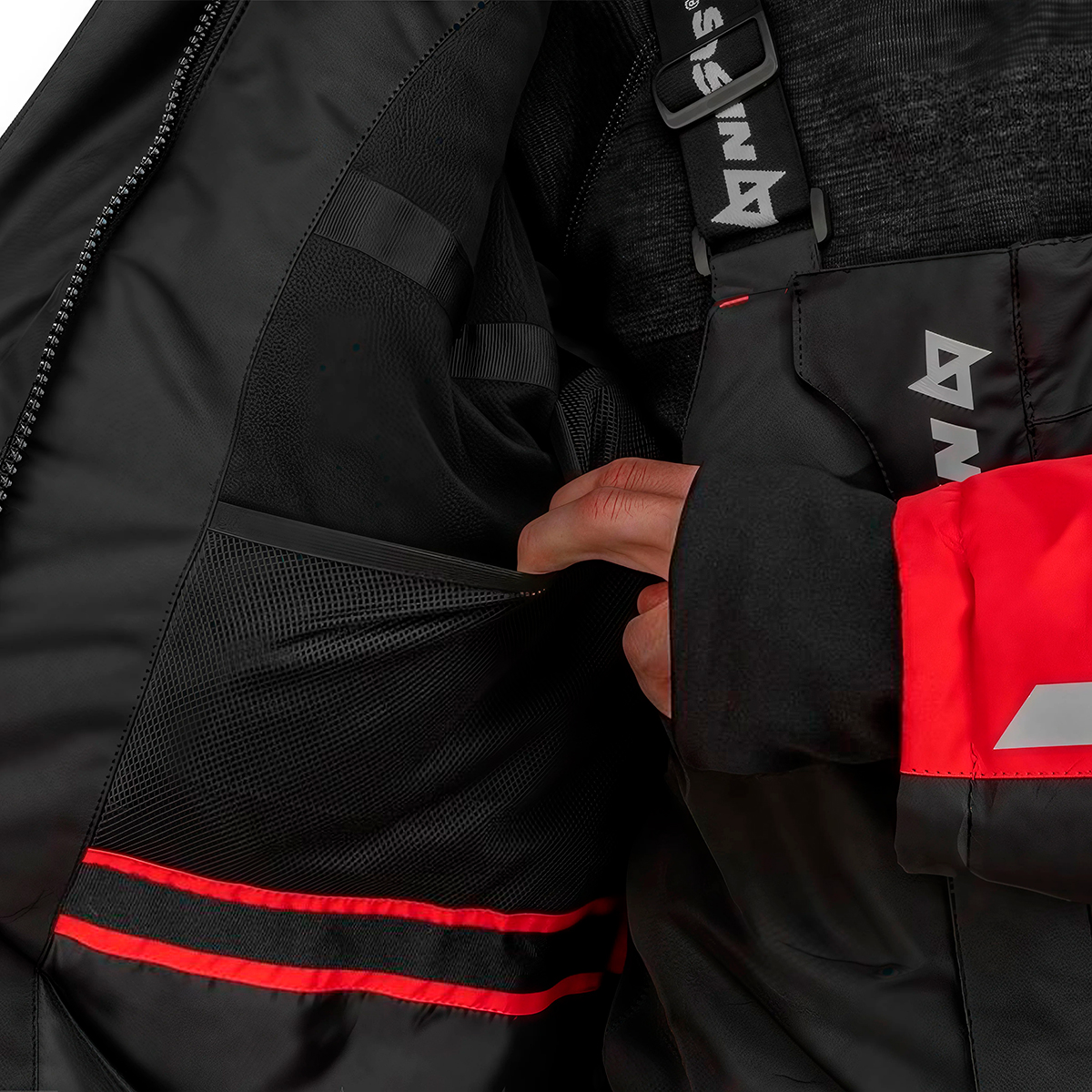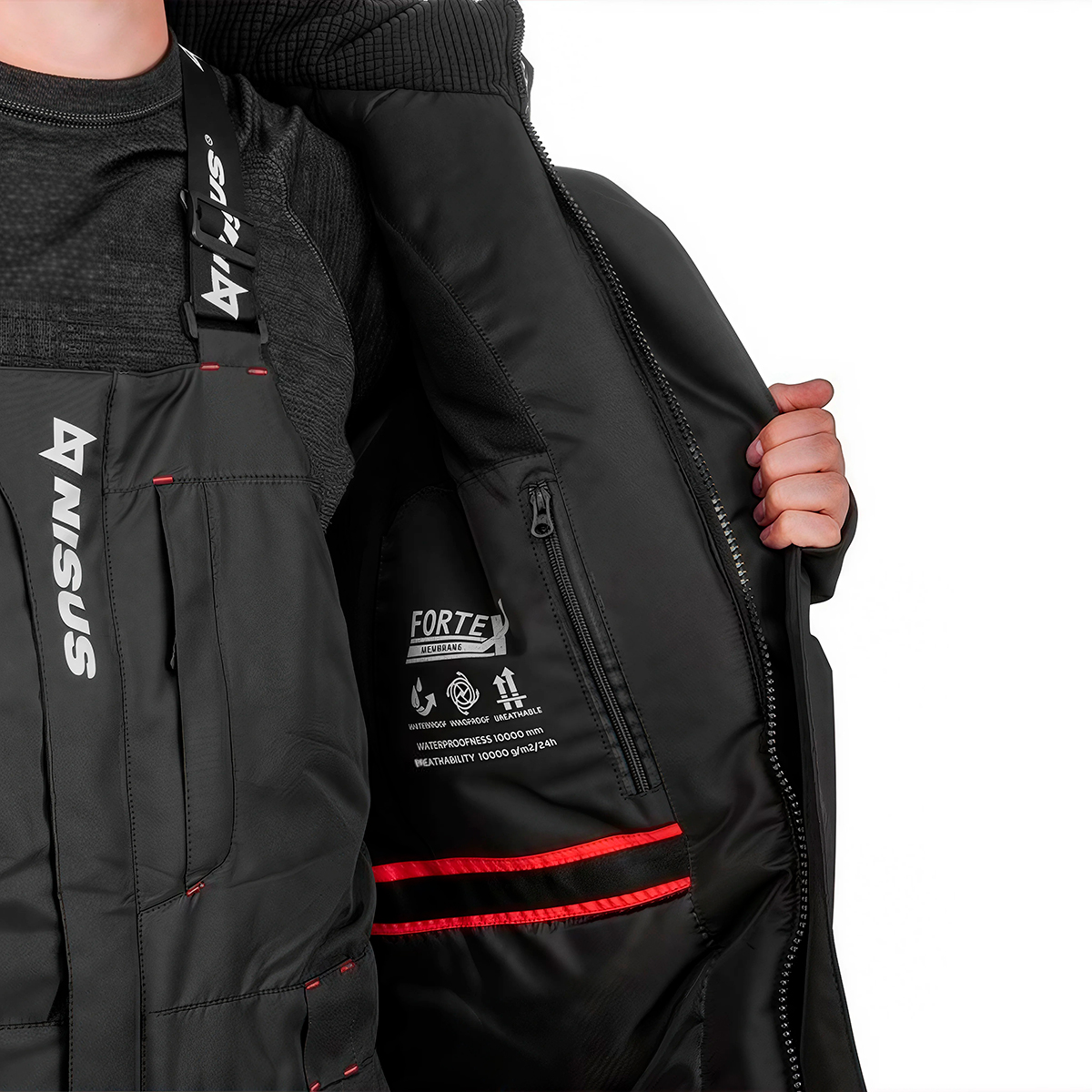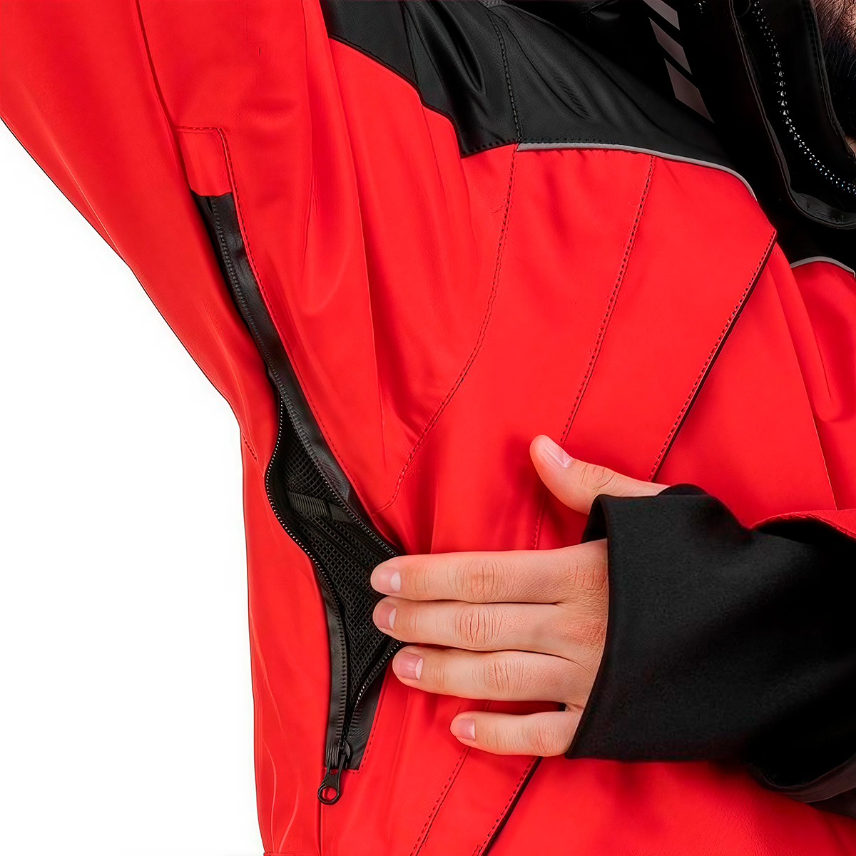 Костюм состоит из куртки и полукомбинезона, изготовлен из высокотехнологичных материалов с применением технологии проклеенных швов и предназначен для использования в сложных погодных условиях (мокрый снег, ветер, сильный мороз, метель). Яркие цвета (красный/черный) в сочетании со светоотражающими элементами способствуют лучшей заметности на льду и снегу, а также в других условиях плохой видимости, тем самым обеспечивая безопасность его обладателю.