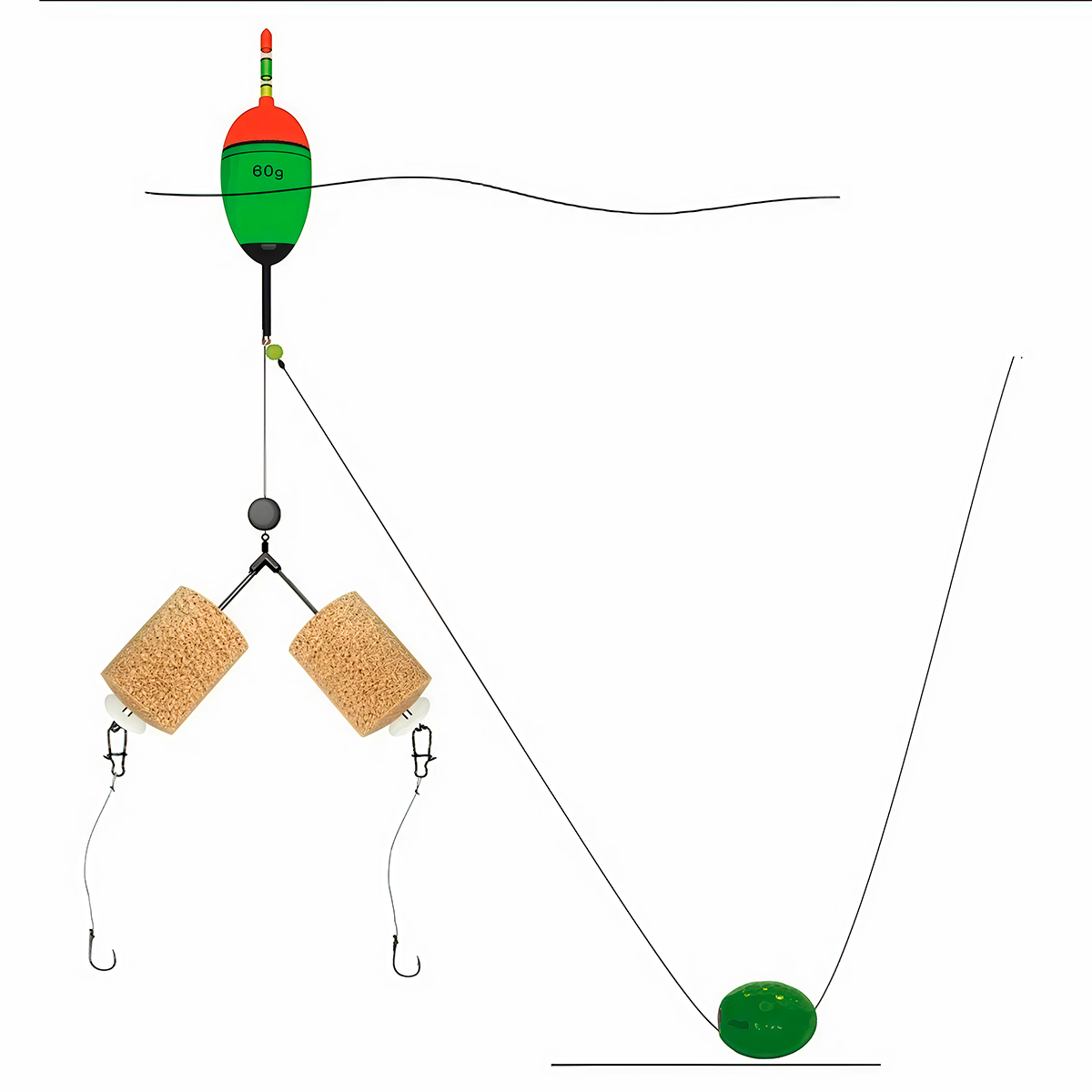 Комплектуется оригинальным EVA-поплавком грузоподъемностью 60г до ватерлинии (80г при полном погружении) с длинным килем и возможностью установки светлячка, уникальным скользящим грузилом с латунной вставкой весом 40г, Λ-образной оснасткой для двух таблеток технопланктона с двумя поводками из мягкой плетенки, качественными большими крючками, стопорками, бусинами, грузиком для подгрузки поплавка.
