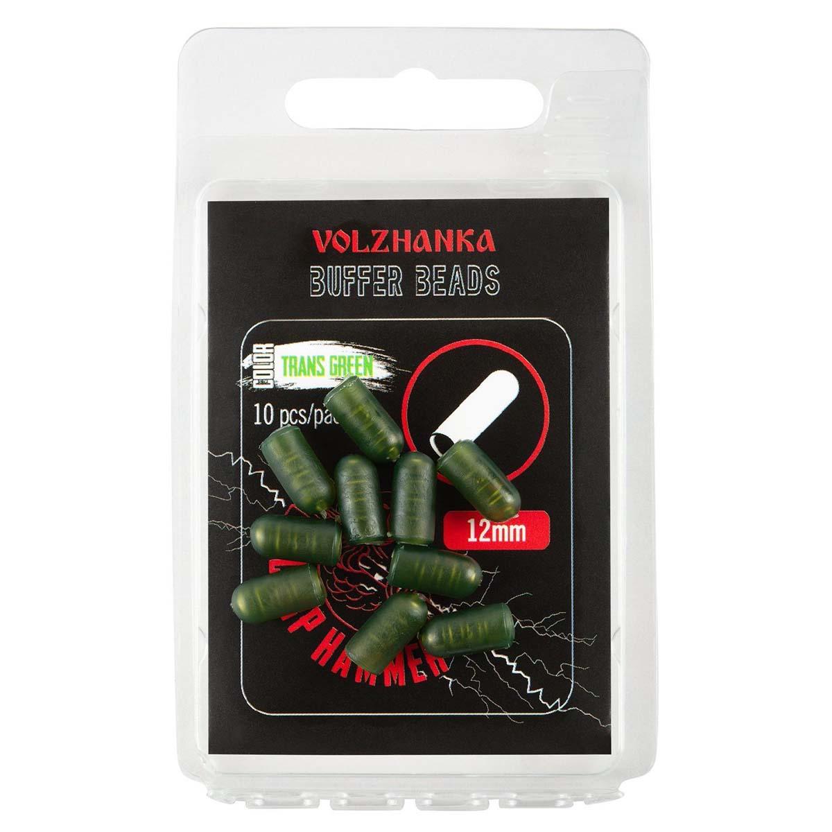 Чем выделяется среди аналогов: размер 12 мм обеспечивает уверенную посадку на узле и надежную буферизацию, а полупрозрачный зелёный оттенок Trans Green помогает маскировке на большинстве донных грунтов и в умеренно прозрачной воде; модельная линейка включает и другие цвета, что позволяет подобрать вариант под условия водоёма. Наличие позиции Buffer Beads в ассортименте бренда подтверждает оригинальное происхождение и совместимость с карповыми комплектующими Волжанка.