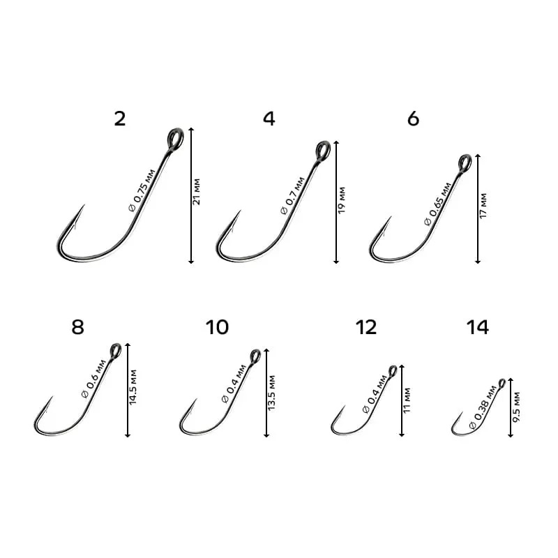 Острое жало S hook надежно пробивает губу рыбы даже во время аккуратных поклевок, а тонкая проволока надежно зафиксирует рыбу и не даст ей сойти. Это самые тонкие наши крючки, диаметр проволоки в нано-размерах начинается всего от 0.38 мм!