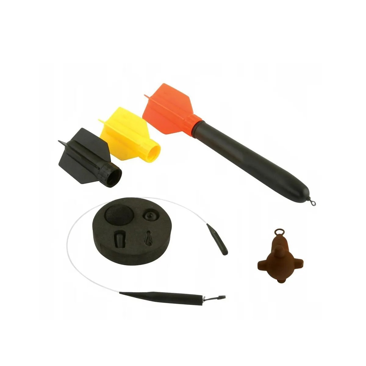 Комплект состоит из прочного поплавка со сменным оперением трех цветов, который легко различим на воде, груз, противозакручиватель и плавающую бусину для заросшего водоема.