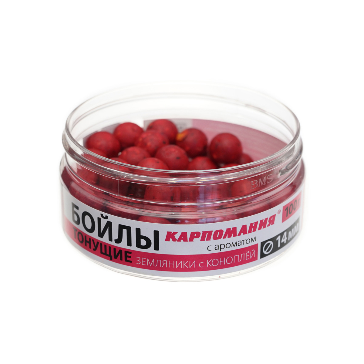 Бойлы Карпомания насадочные, тонущие 14мм 100гр Земляника-Конопля, в банке