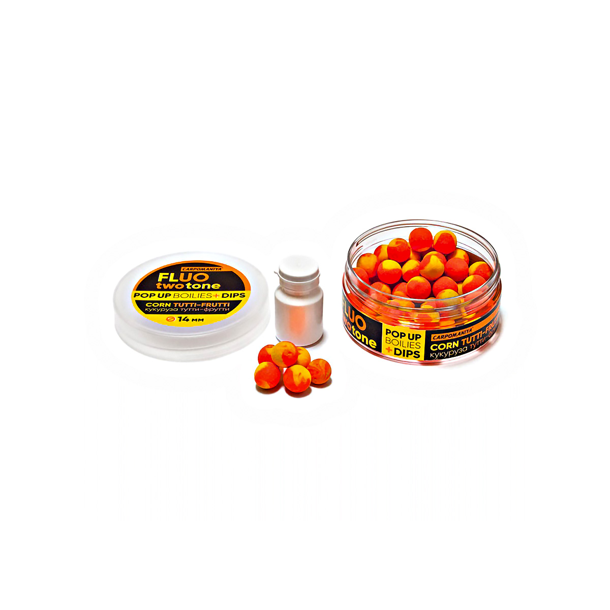Бойлы Карпомания Pop-Up Fluo Two Tone Dips плавающие 14мм 60гр Кукуруза-Тутти-Фрутти, в банке